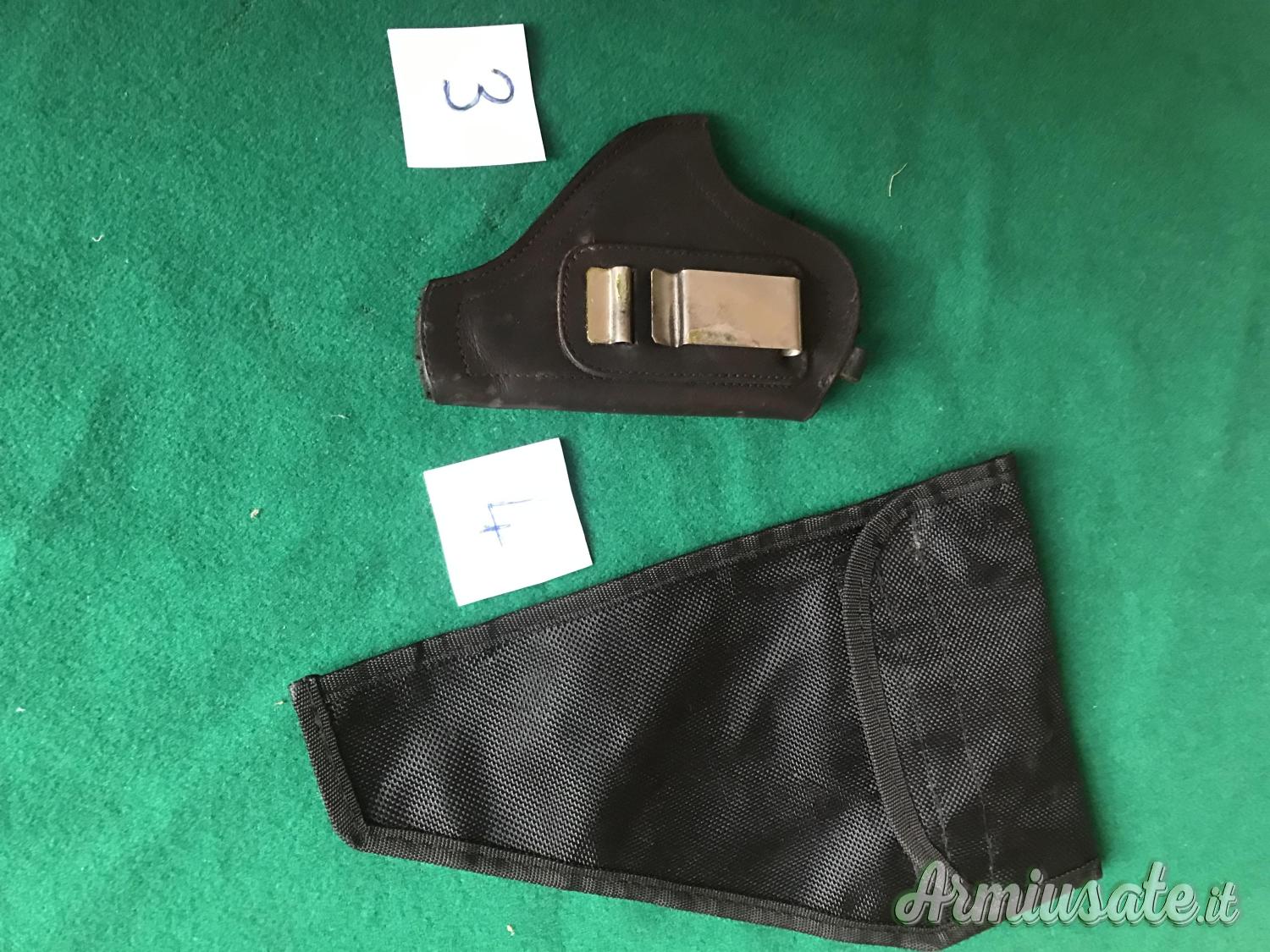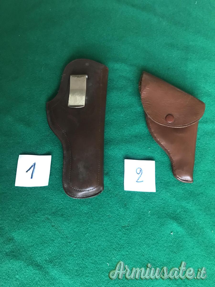 Cedo 2 fondine in pelle: la n. 1 con gancio per cintura, la n. 2 con automatico e passante per cintura. Regalo agli acquirenti n. 2 fondine nere, come da foto, una grande in sintetico e l’altra piccola in pelle. Euro 12 cadauna. Spedizione a 5 euro