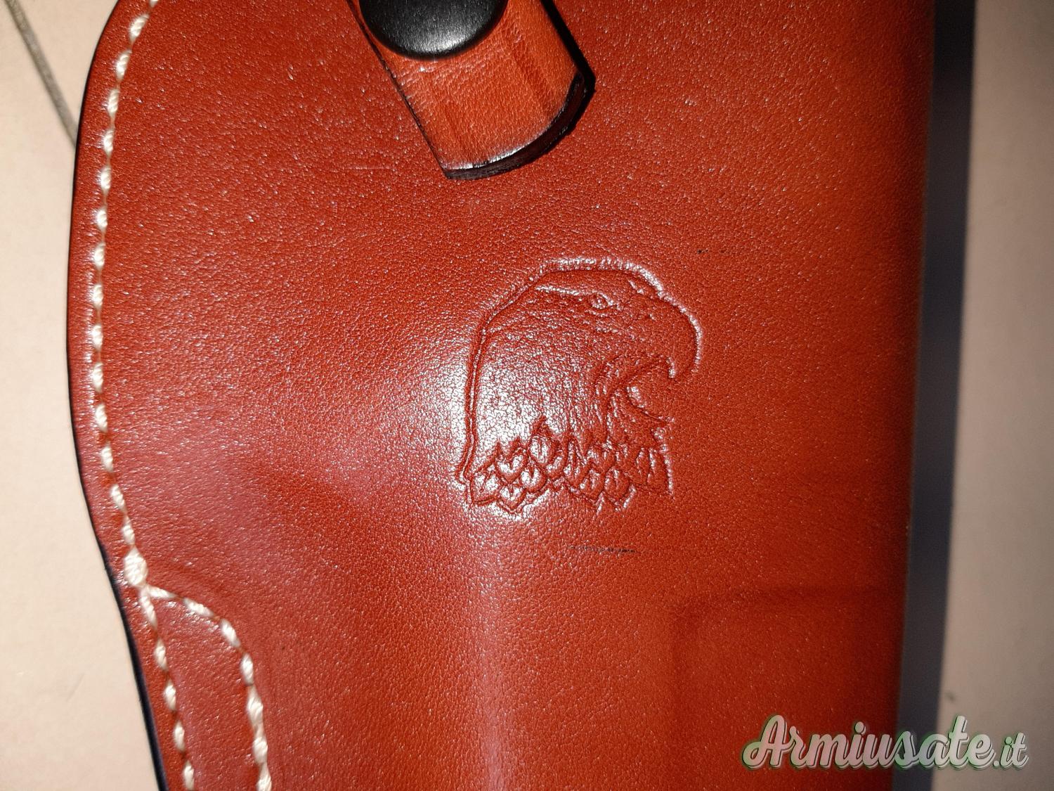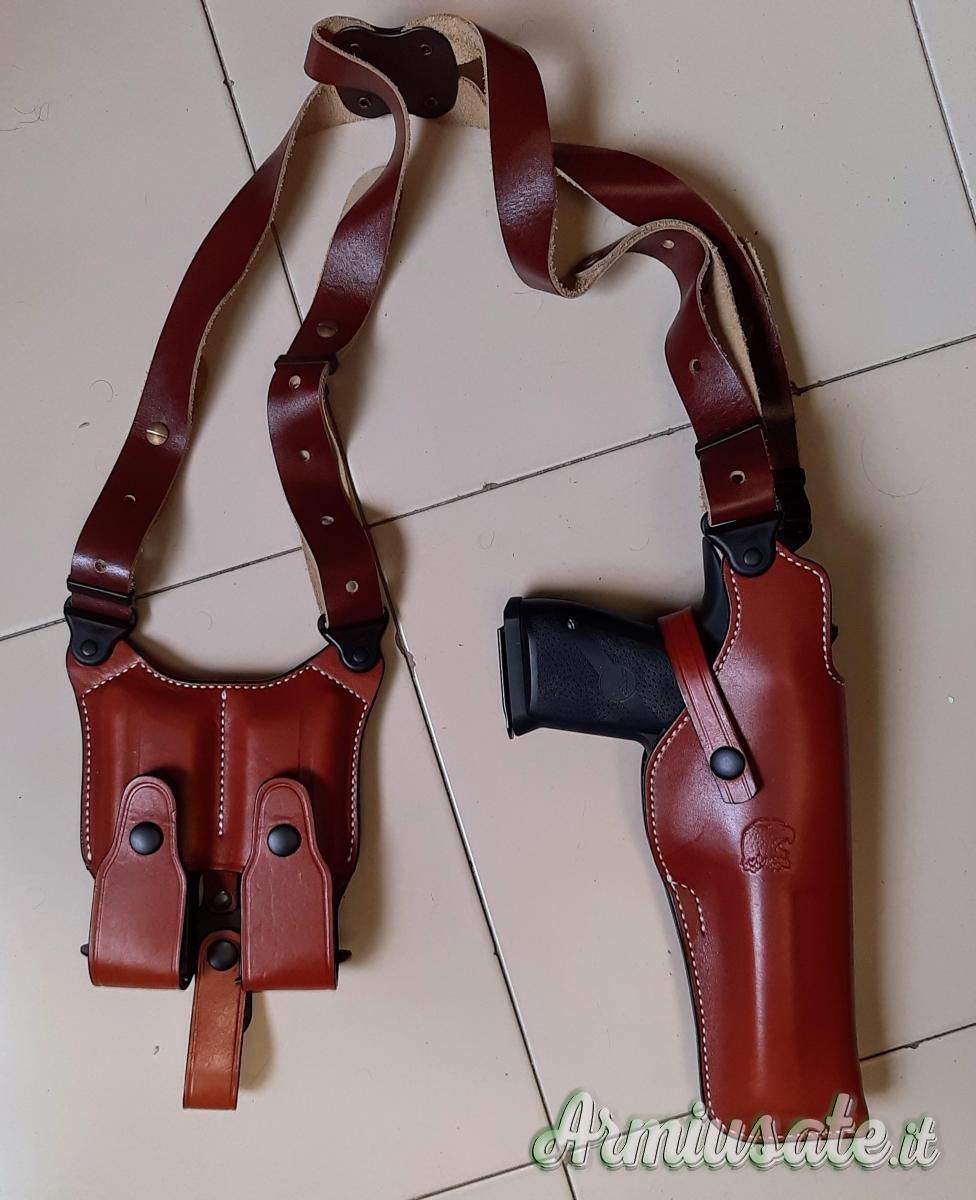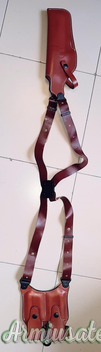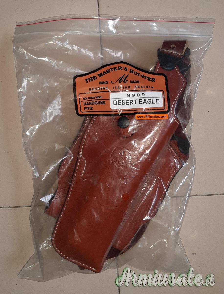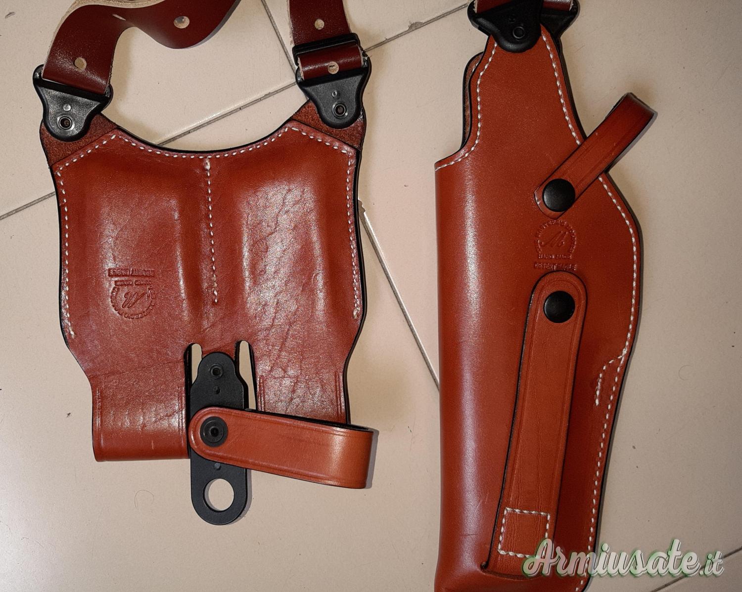 Fondina ascellare per Desert Eagle (Mark I, Mark VII e Mark XIX) prodotta dalla The Master's Holster su specifica commissione della Magnum Research per vendita autorizzata su store ufficiale. Mai usata, aperta solo per fare le foto indicative con arma. Realizzata a mano artigianalmente in vero cuoio made in Italy. Vendo a 150 spedizione inclusa. Per acquistarla dovreste importarla dagli Stati Uniti e pagare spedizione e dazi, qui viene offerta spedizione inclusa a meno del solo costo d'acquisto dagli USA.