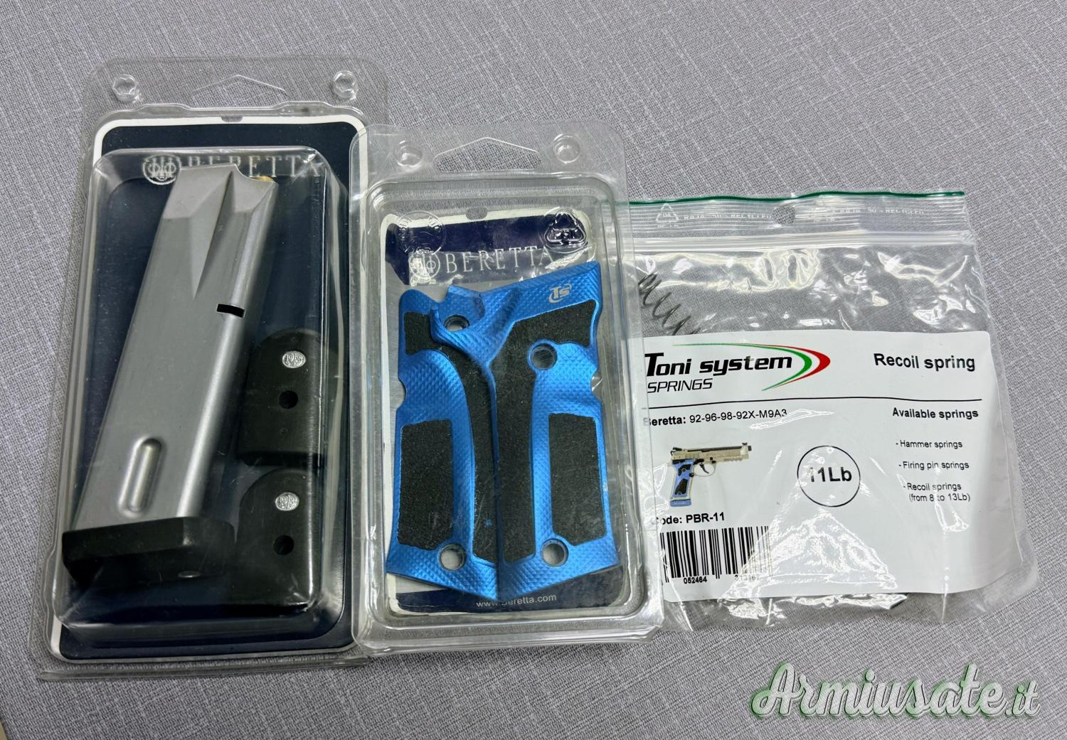 Vendo guancette per 92x performance della Tony System, più molla di recupero da 11 libre, caricatore per 92 con pad in gomma più altri 2 pad in gomma Beretta