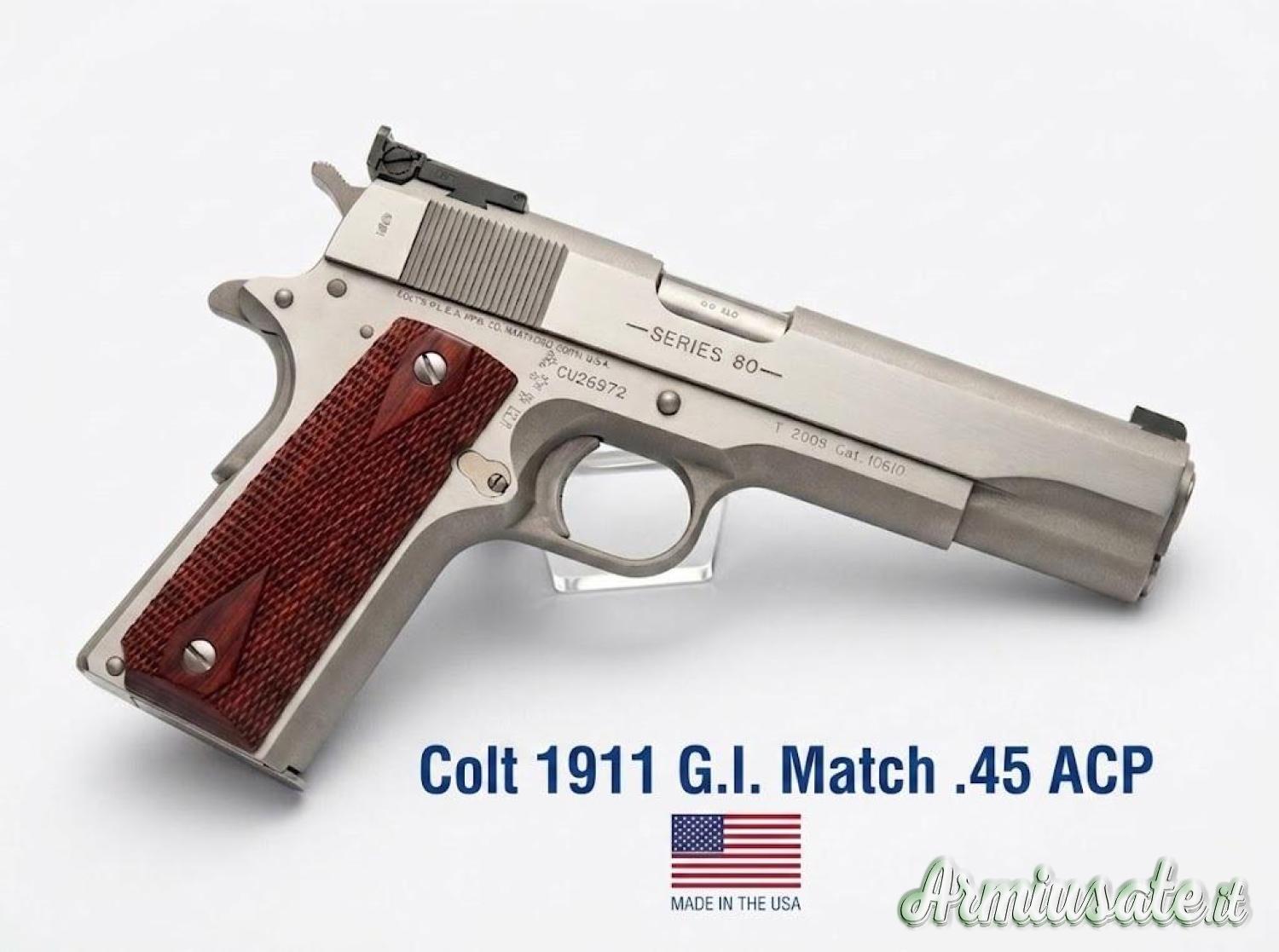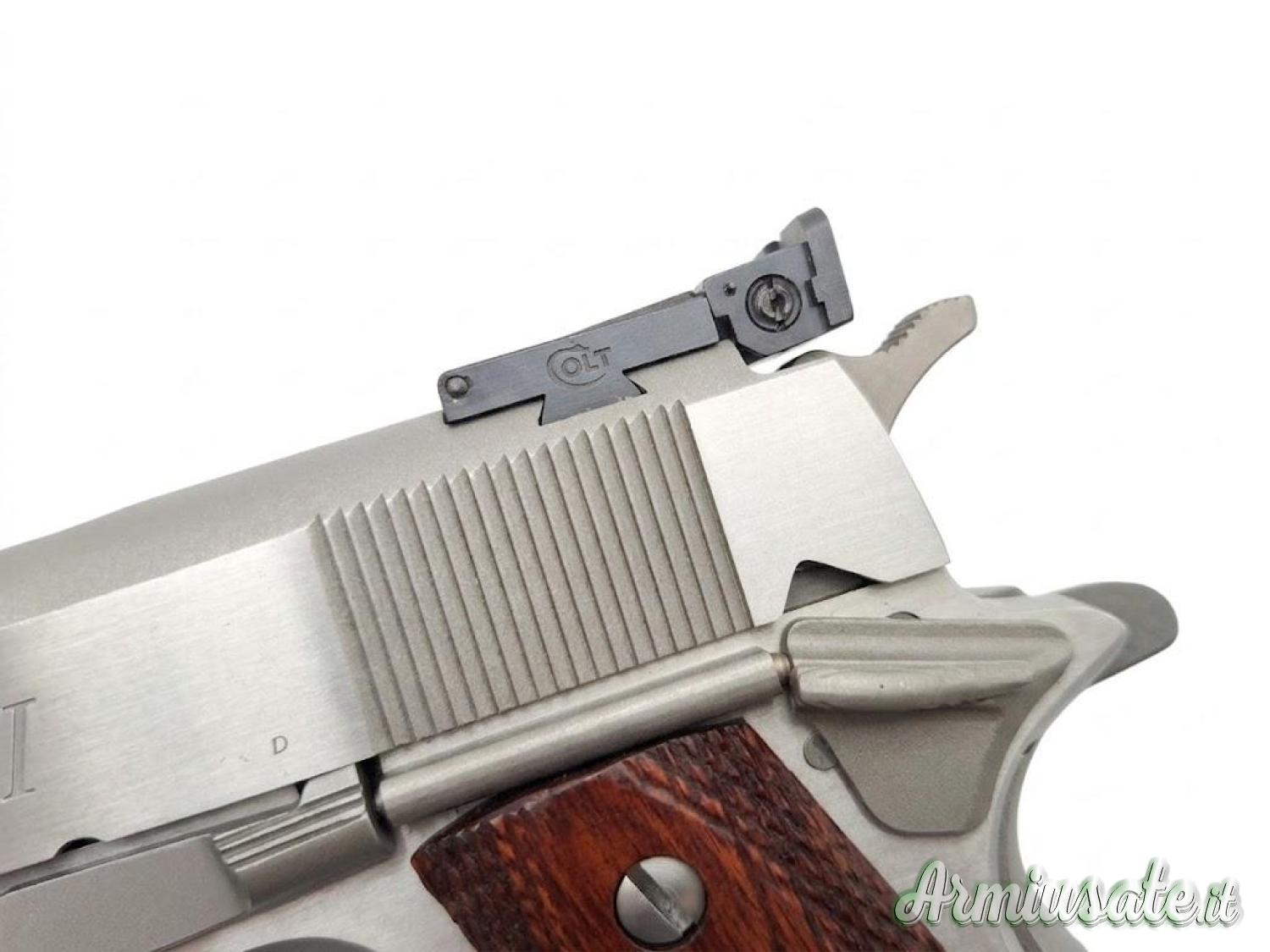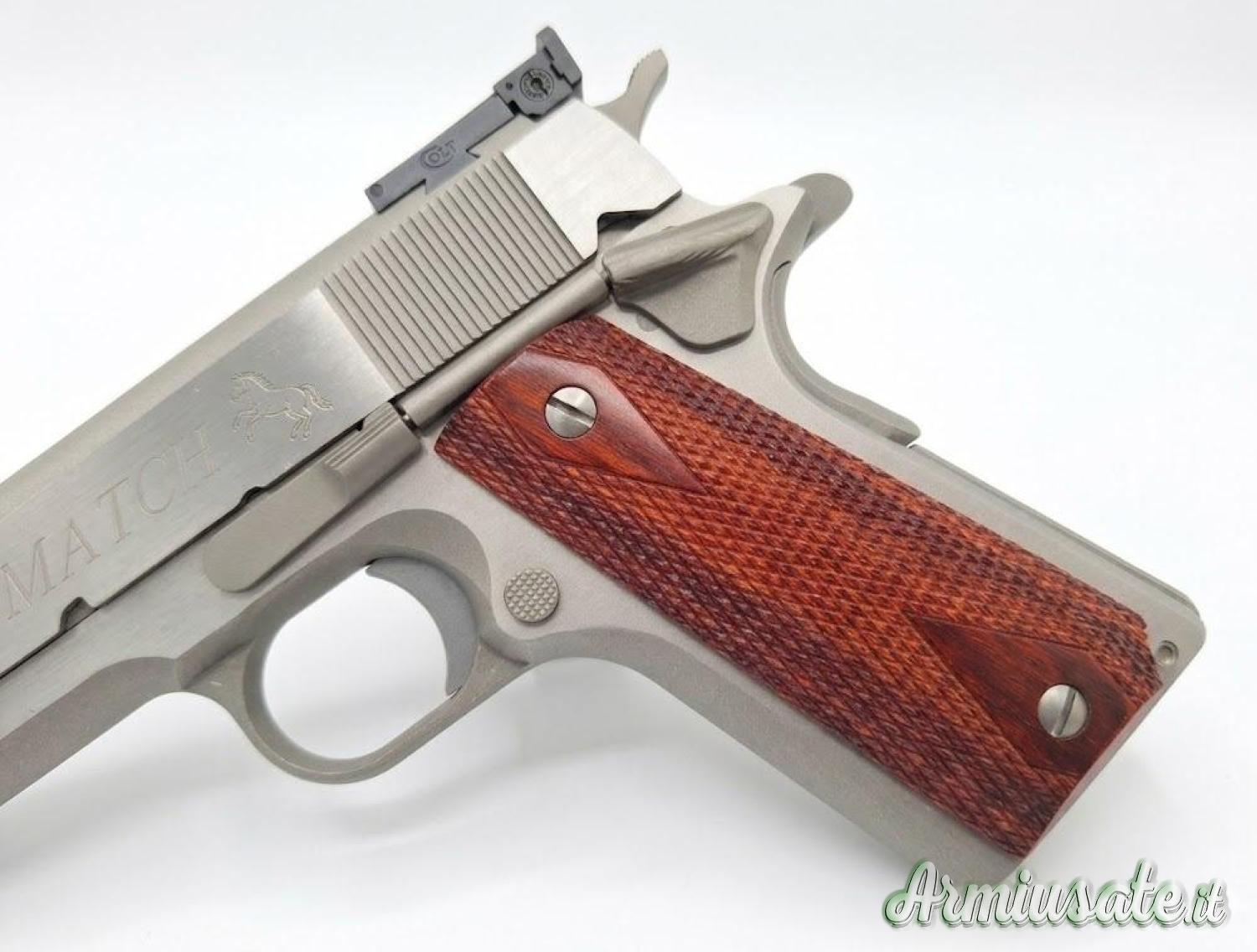 Colt modello 1911 G.I. Match calibro 45ACP - prodotta dalla Colt's Manufacturing Company - classificazione Arma Sportiva - Numero di colpi 8+1 - Canna 127mm National Match - righe e passo 6 righe destrorse passo 1:16 - tacca di mira regolabile - Finiture Fusto inox parkerizzato carrello inox - Peso 1100g