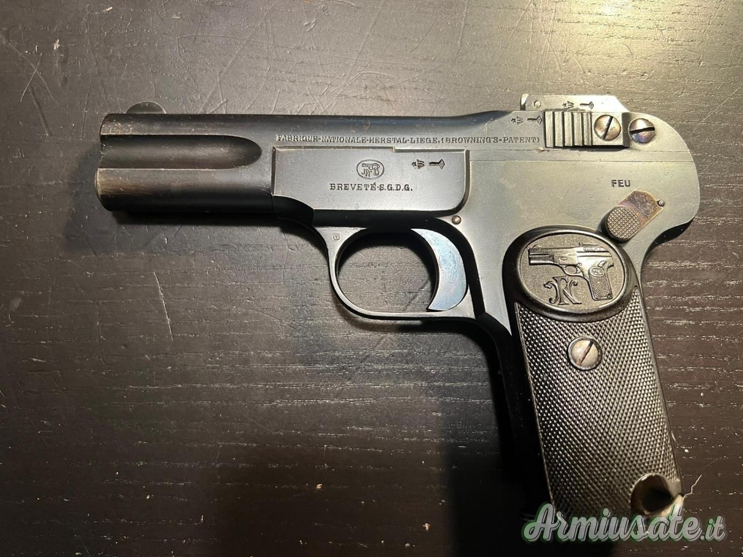 Arma in ottime condizioni, meccaniche ed estetiche, nonostante sia stata prodotta nei primi anni del XX secolo (120 anni fa). Si tratta della prima versione del modello 1900, riconoscibile dalle scritte sul fusto e dal logo sulle guancette con il monogramma “FN” di piccole dimensioni e il profilo della pistola. Presenta solo i punzoni dell’epoca, senza punzoni di Banchi di Prova moderni, ovviamente monomatricola.
