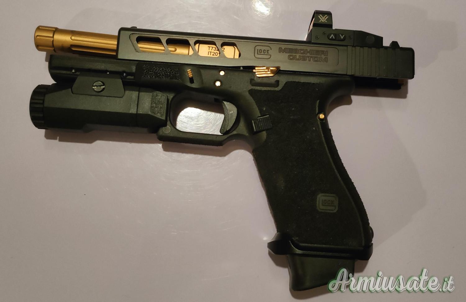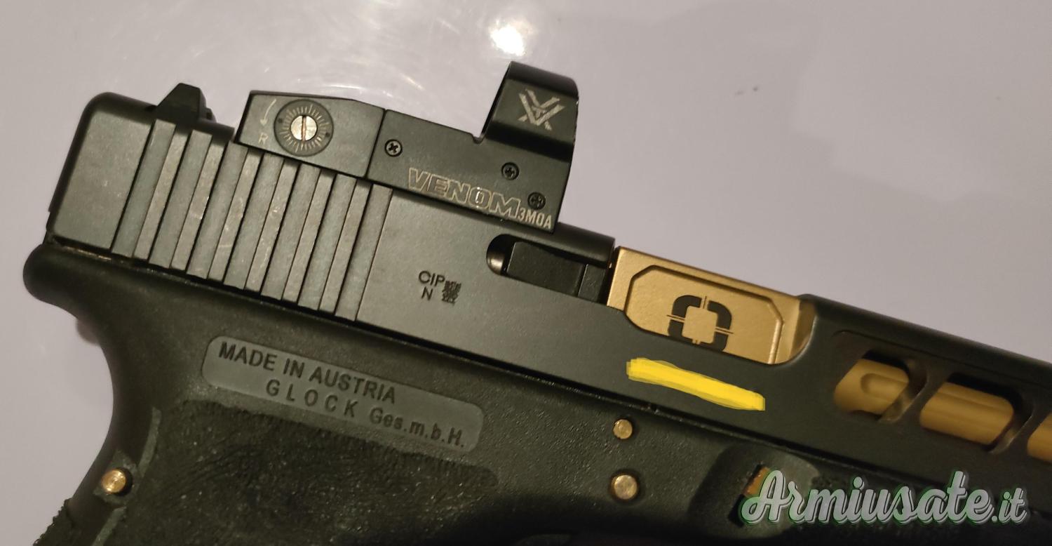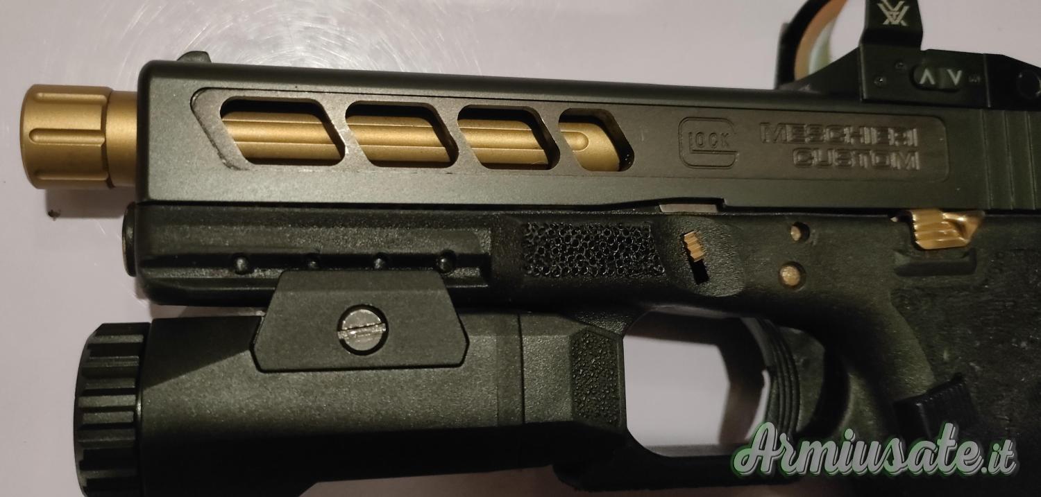 Compresi nel prezzo i pezzi originali sostituiti (leva sgancio carrello, perni, molle, connettore, tappo posteriore, canna filettata + coprifiletto originale Glock +valigetta e dorsalini originali Glock compresi)