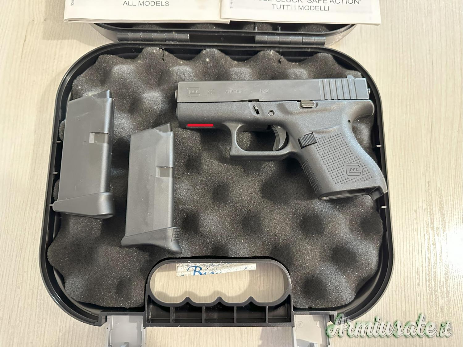 Glock mod.43 cal.9x21 usata pochissimo ed in ottimo stato. Comprende due caricatori, valigetta, speed loader e fermaglio metallico come in foto per porto senza fondina, fondina sagomata in kydex.