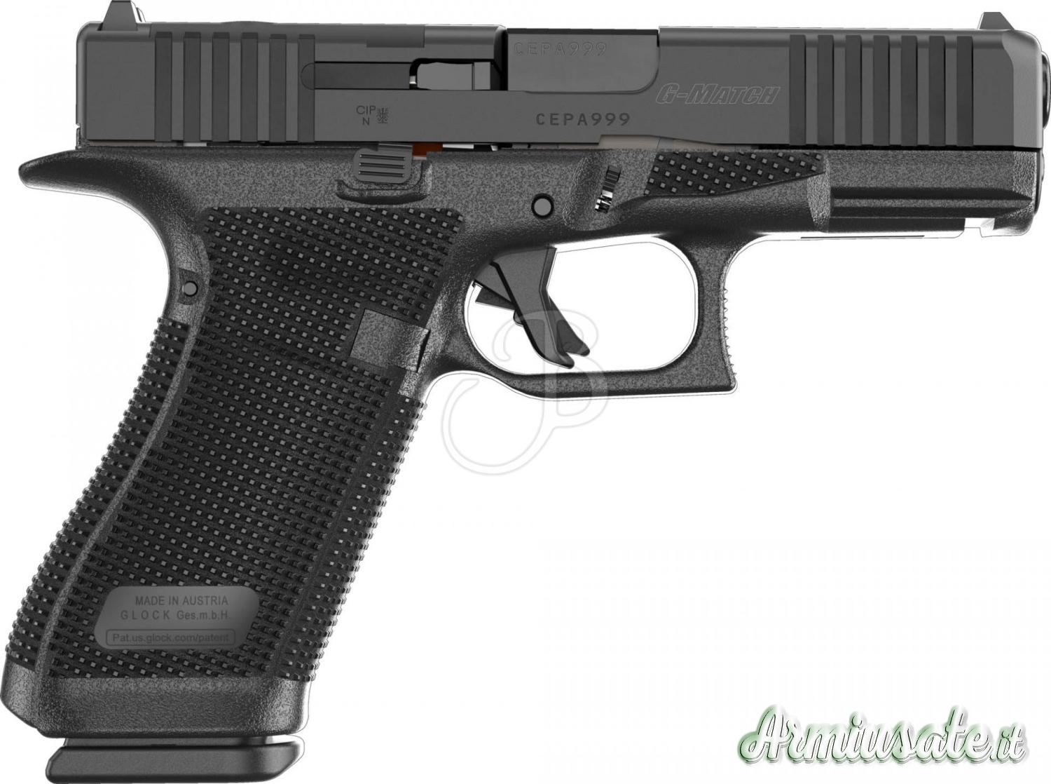 Glock 45 Gen6, la crossover con fusto della G17 e carrello della G19, un nuvo standard nelle armi corte. Nuovo grip RTF6 per avere una presa sempre salda, il fusto presenta una leggera "bombatura" per permettere una presa più confortevole, minigonna accentuata per un cambio caricatore più rapido, undercat sotto la guardia del grilletto per una presa più alta, bevertail posteriore per un controllo migionre in fase di rilevamento, grilletto flat, thumb rest ambidestro per una presa costante dell'arma, protezione della leva blocco carrello maggiorata, intagli di presa frontali e posteriori ridisegnati, sistema optioc ready riprogettato per un montaggio di ottiche più basso, asta guidamolla ridisegnata con molla singola e nuovo estrattore. Versione classificata sportiva.