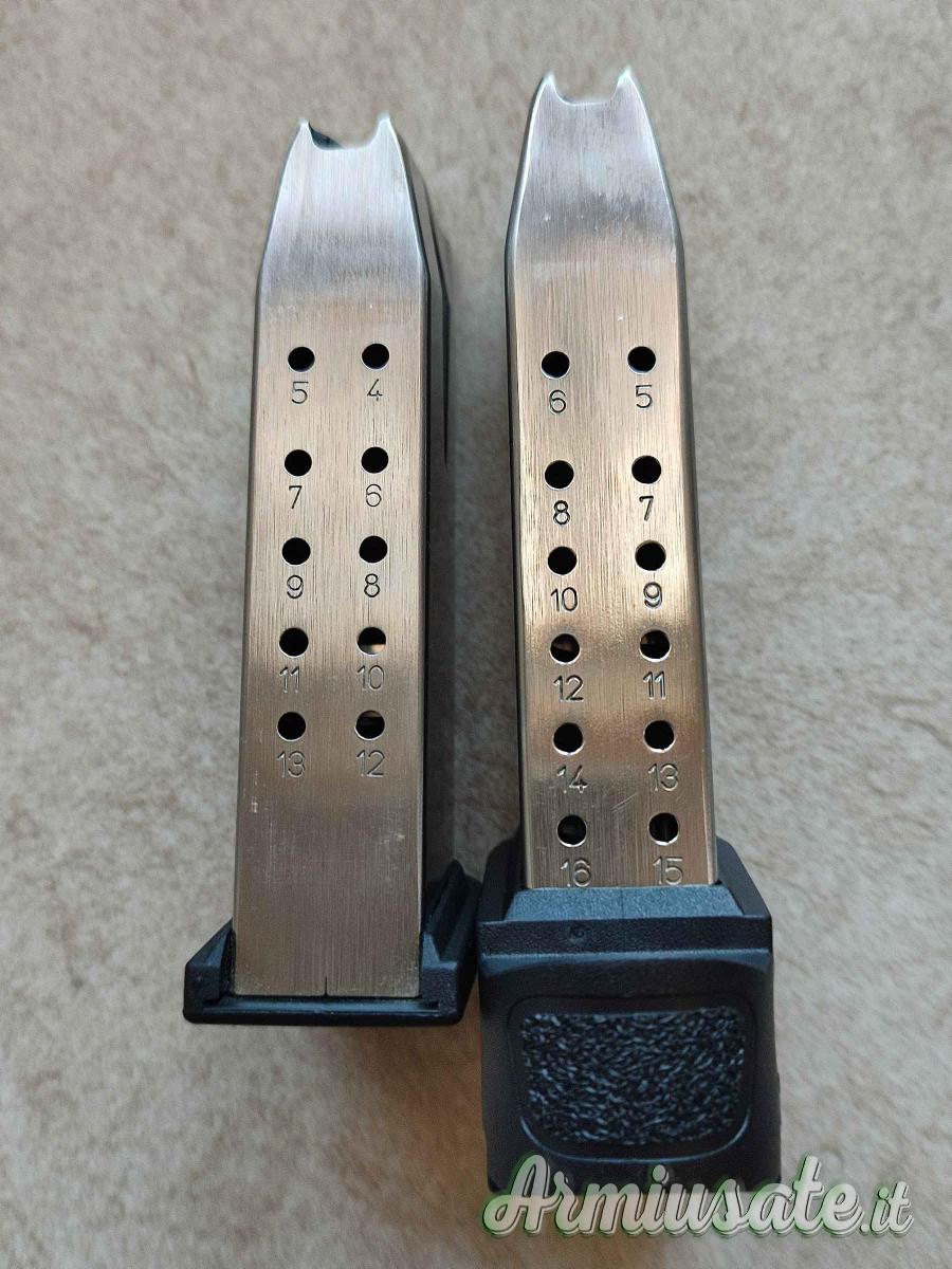 Ideale per il porto occulto, dimensioni ridottissime (158 x 120 mm) ma grande potenza di fuoco: 2 caricatori il piccolo 13+1 il grande con pad che allunga l'impugnatura e porta la capienza a 16+1 colpi.