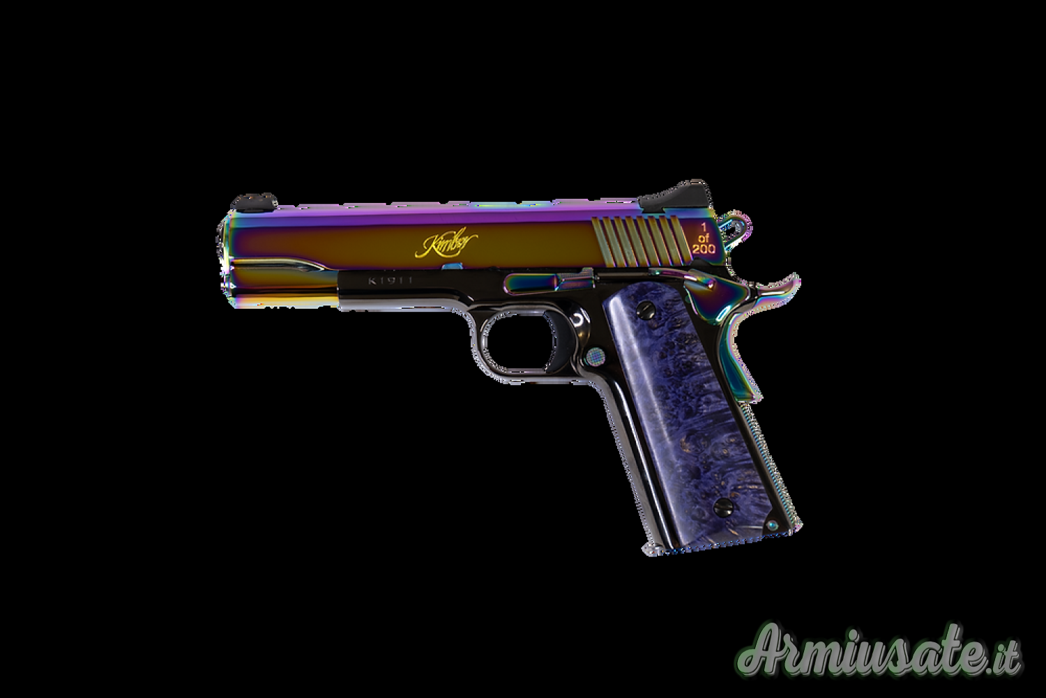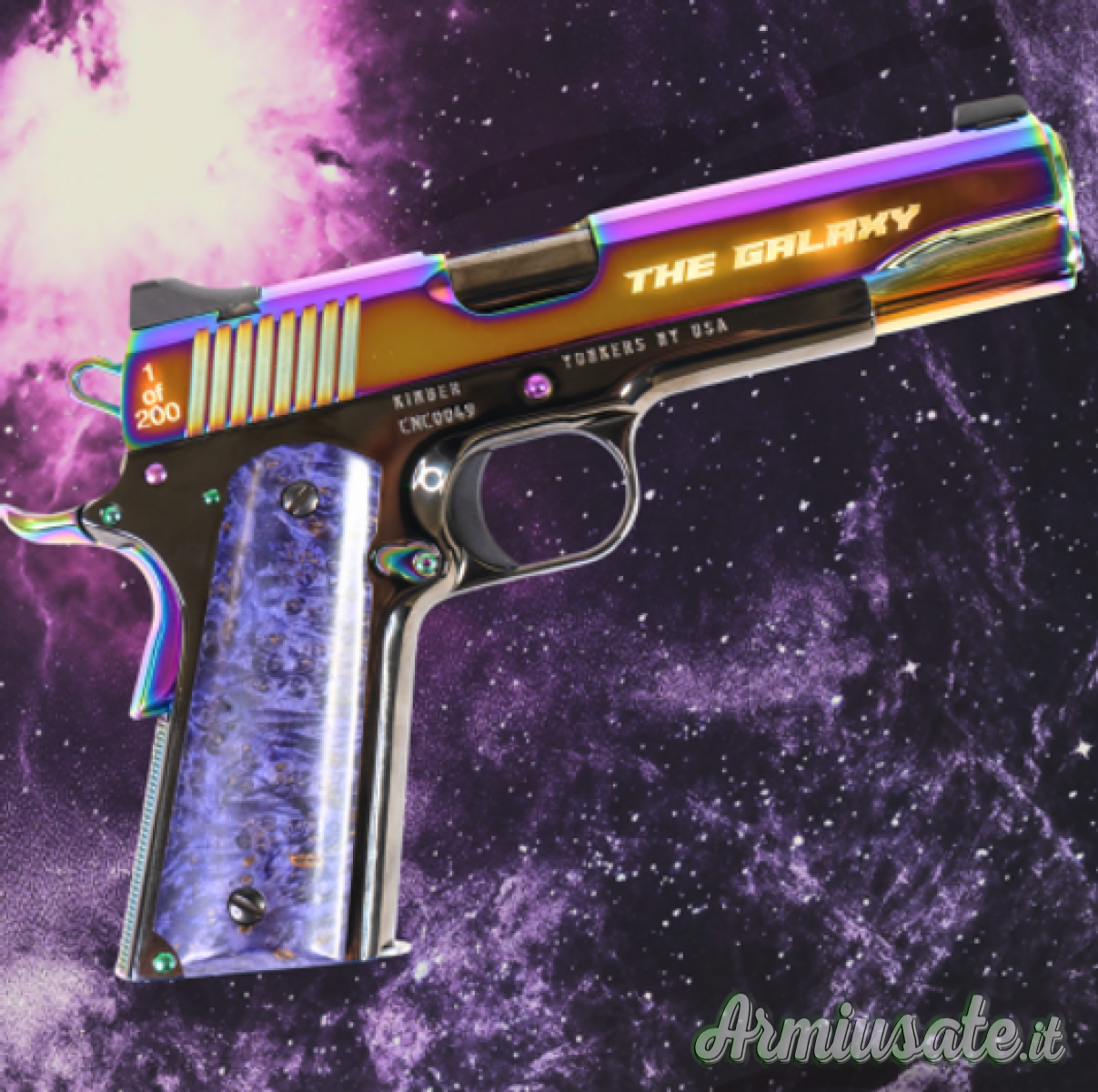 CNC Firearms è orgogliosa di presentare la "Kimber 1911 Galaxy" in una serie limitata di 200 esemplari. Questo telaio Kimber 1911 è una costellazione di bellezza, dal carrello e dai comandi in PVD arcobaleno lucidati a specchio, alle eleganti impugnature in radica d'acero tinte di viola realizzate a mano. La "Kimber 1911 Galaxy" conquisterà sicuramente qualsiasi amante delle stelle. Ogni pezzo è accompagnato da una moneta sfida e da un certificato di autenticità, firmato dal proprietario di CNC Firearms. CNC Firearms onora l'integrità della "Kimber 1911 Galaxy" e promette di non riprodurre mai più questi pezzi, per consentire a ogni pezzo di aumentare il suo valore come cimelio di famiglia da tramandare di generazione in generazione.