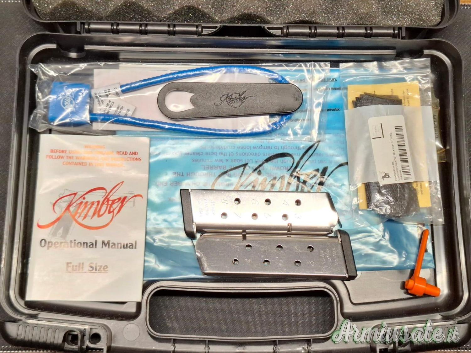 Kimber modello Custom TLE II – calibro 45 ACP – n° 3 caricatori Kimber da 8 colpi – n° 1 coppia di guancette oltre a quelle già montate in G10 – dotazioni come sul nuovo con valigetta e tutti i gadgets di serie (vedi foto) – in omaggio fondina in polimero porta caricatore doppio sempre in polimero – Arma catalogata Sportiva –