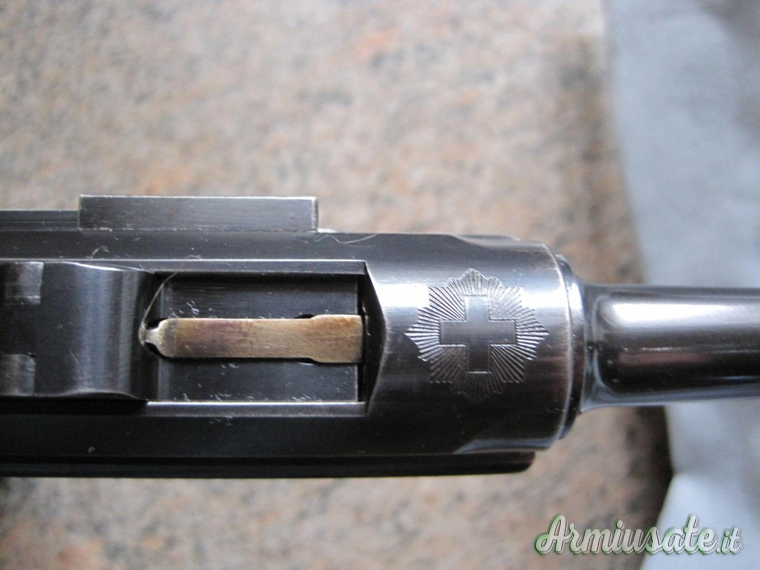 Cedo LUGER DWM Svizzera mod. 1900 cal. 7,65 parabellum croce nel sole matr.2700.Brunitura originale , canna a specchio con rigature molto ben definite ,mono matricola,sul ponticello la P di privatizzazione,giunto a ginocchiello a 3 cerniere,caricatore a 8 colpi,lunghezza canna 120 mm. ,lunghezza totale 238 mm.,peso arma scarica900 gr. presenta sulla camera di cartuccia la croce nel sole,sull' elemento anteriore dell' arco a 3 cerniere è riportato il simbolo DWM. PERFETTA Vero pezzo da collezione . Prezzo € 3800 NO Permute