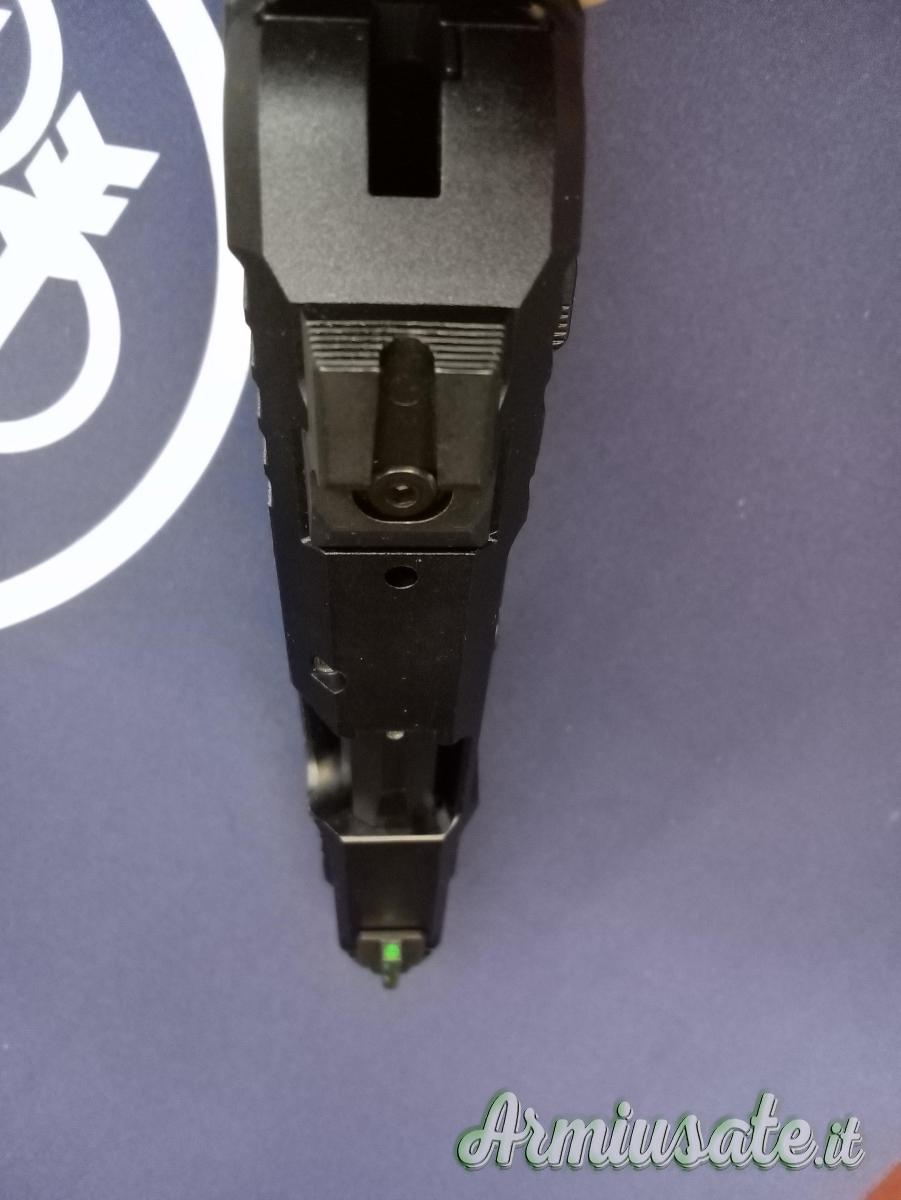 Mirino con inserto in fibra ottica di colore verde per una rapida acquisizione del bersaglio; tacca di mira anti impigliamento la cui parte anteriore può essere usata per scarrellare in condizioni di emergenza!