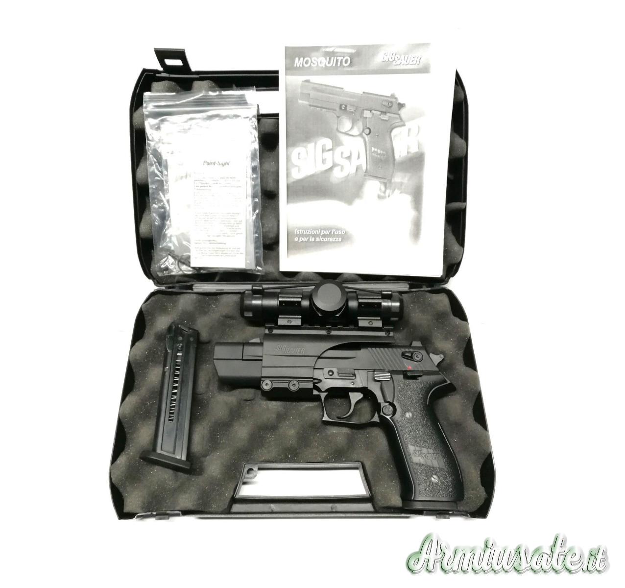 Pistola sportiva SIG Sauer modello Mosquito è una semiautomatica basata sulla SIG Sauer P226, ma il 10% più piccola e camerata per il calibro 22lr. Canna da 5" con attacco bridge e red dot con regolazione d'intensità che vi consentirà di utilizzare il punto in base alle condizioni di visibilità. Dotazione valigetta e doppio caricatore, manuale di smontaggio.