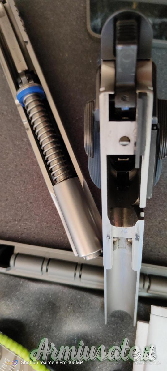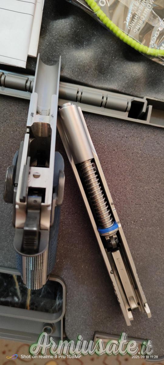 La tacca di mira nera è regolabile in alzo e deriva. E nero è anche il mirino. Infine, il caricatore monofilare può ospitare otto colpi in calibro .45Acp e presenta sei fori per un rapido controllo delle munizioni presenti.