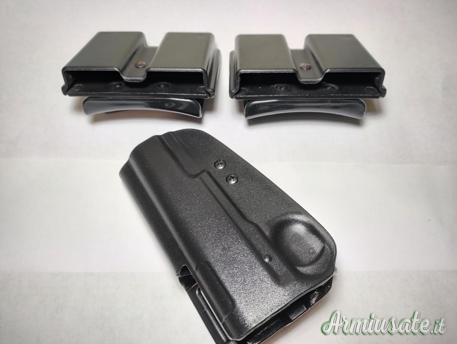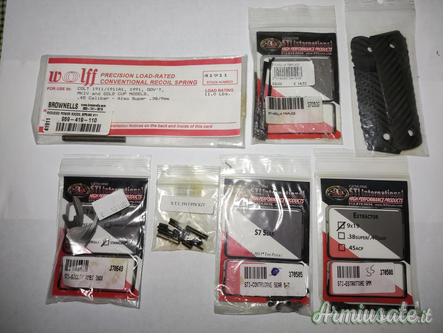 Mirino in fibra, minigonna integrata, triplice alleggerita, sicura mano sx, guancette in legno sti, guancette in polimero ultra slim, fondina in polimero, 4 porta caricatori, pezzi di ricambio originali sti, 4 caricatori Wilson combat usati una volta, 4 molle di ricambio x caricatori nuovi.
