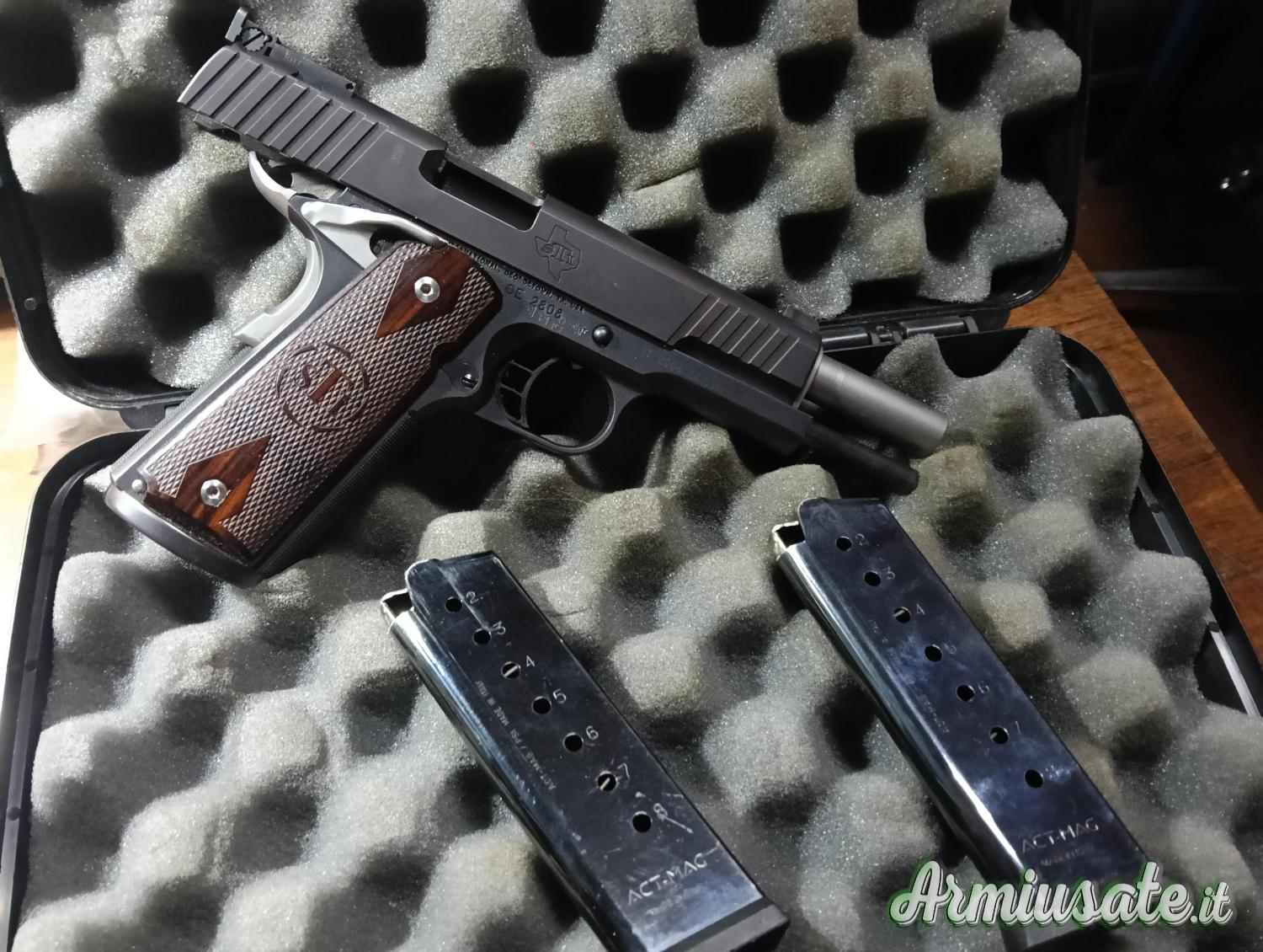 Range master è un tradizionale 1911 costruito secondo gli standard moderni di fascia alta per una pistola eccezionale da competizione o per autodifesa. Con mirini regolabili in stile Bomar, è pronto per competere nell'IPSC .La canna è una canna da 5,0" con rampa e completamente supportata. Questa eccellente arma da fuoco è dotata di serie di un cane quadrato STI, sistema di scatto STI brevettato, scatto STI S-7 e montante in titanio per un funzionamento fluido e affidabile.