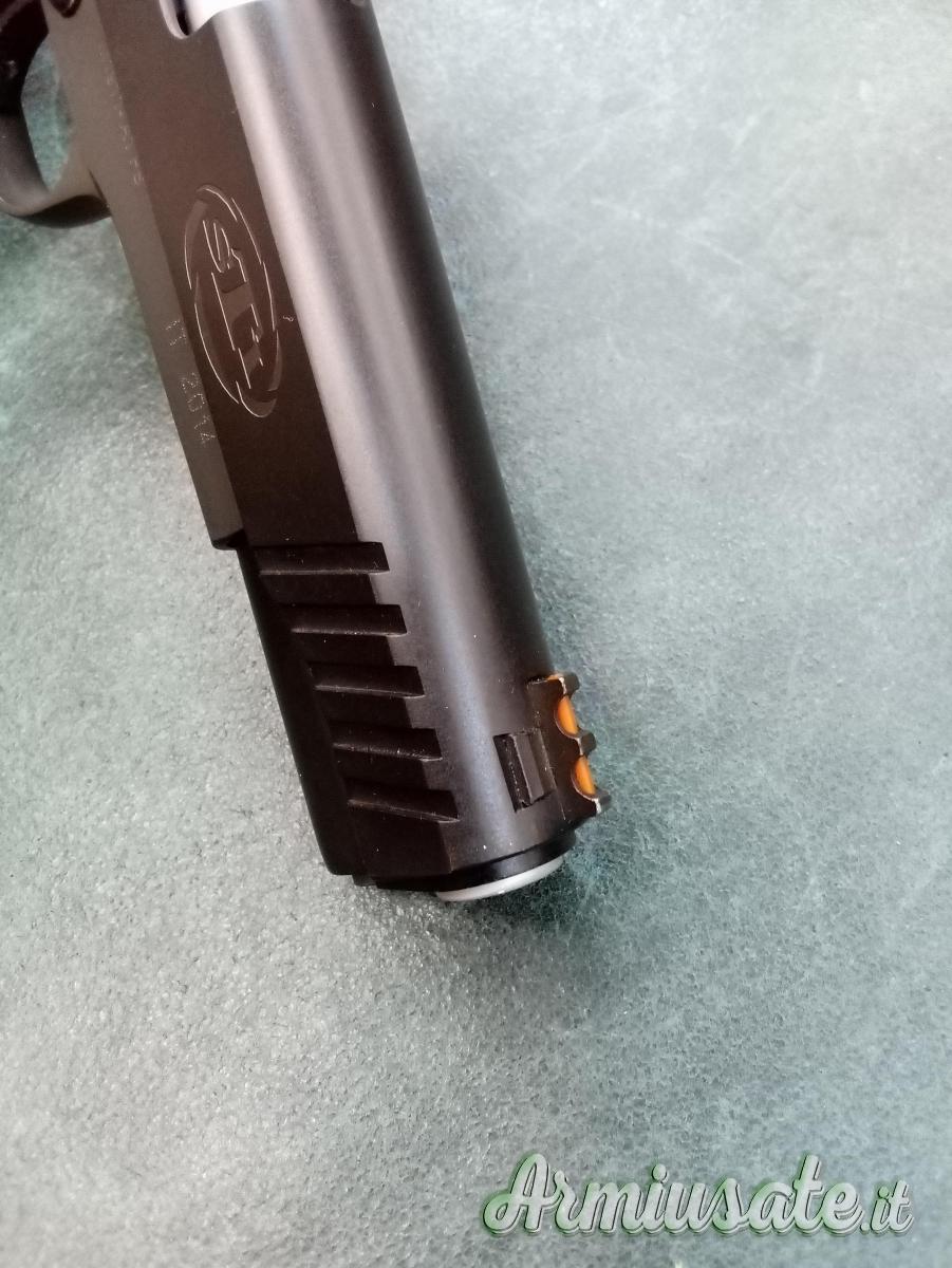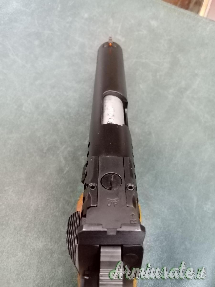 Tacca di mira regolabile e mirino in fibra ottica di colore rosso; guancette in legno di noce.