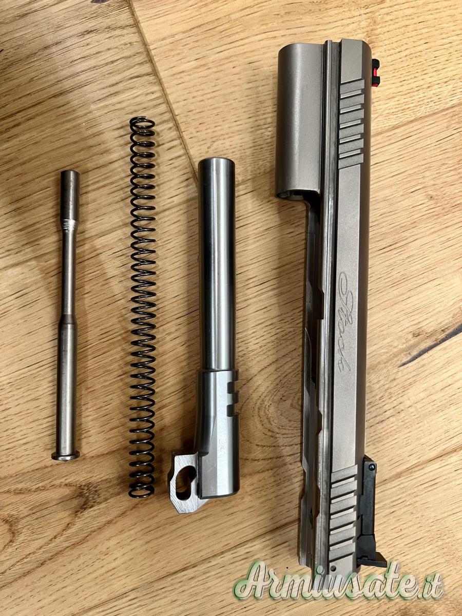 Pistola semiautomatica in doppia azione adatta per le gare di Tiro Dinamico con: canna cilindrica, carrello in acciaio con ampie zigirinature per un facile azionamento, fusto integrale fino alla volta dell'otturatore con attacco rail per il posizionamento di torcia/puntatore laser. Il Gancio caricatore è custom, la sicura ambidestra, in ques'edizione speciale il modello Stock III ha finitura nichelata, optional: mirino in fibra ottica (50€).
