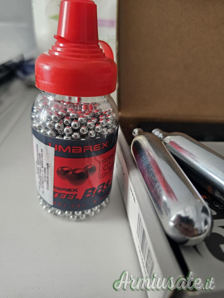 Inculse nella vendita anche 2 bombolette e 1 scatola di pallini in acciaio Umarex.