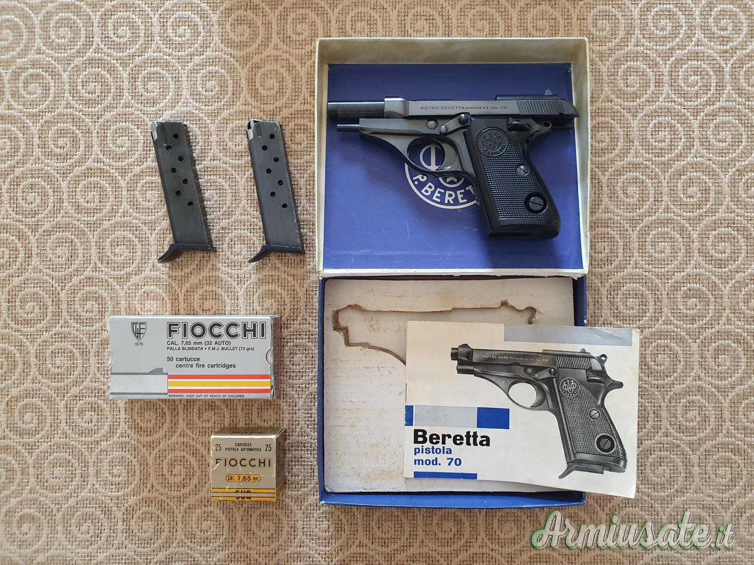 - BERETTA mod. 70 in calibro 7,65 di seconda generazione (sicura a leva e non a traversino, in grado di bloccare in aggiunta anche il carrello in chiusura una volta inserita), con organi di mira modificati per un tiro più rapido e preciso, caricatore da 8 colpi, scatola e libretto/manuale originale;