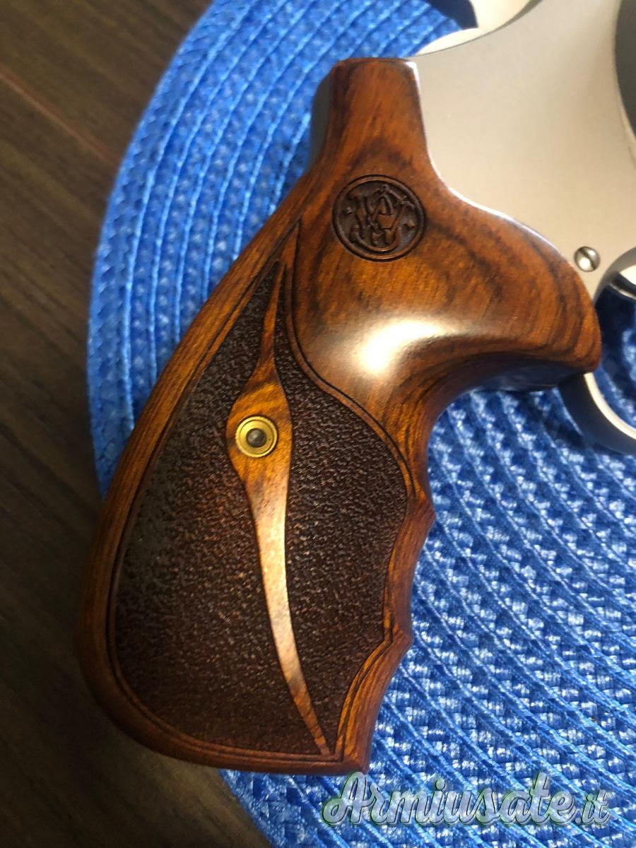 Ovvero la rinomata e famosa modello 627 calibro 357 Magnum. Il revolver meglio riuscito di tutti i tempi. Vanta un tamburo dalla notevole capacità di 8 colpi, eguagliato solo dai Taurus di ultima generazione, impugnatura semianatomica in legno pregiato che si intona ottimamente con la finitura inox, mirino speciale montato su un alzo metallico e canna di 5"con la carenatura inferiore piacevolmente rastremata verso la volata. Lo scatto è accuratizzato a mano dai tecnici del PC e reso di una fluidità e leggerezza incredibili. Insomma, un pezzo di alto collezionismo ma da utilizzarsi con soddisfazione anche in poligono!