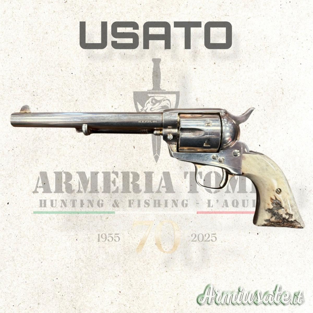 Splendido revolver Uberti usato in perfette condizioni. Cilindro da 6 colpi ad azione singola. Il lato sinistro della canna è marcato S.A. CAL. 45, la parte inferiore del telaio è marcata con il numero di serie e il codice data. Meccanica e azione perfetta cosi come anche il tamburo. Impugnatura in corno. Completa di scatola originale.
