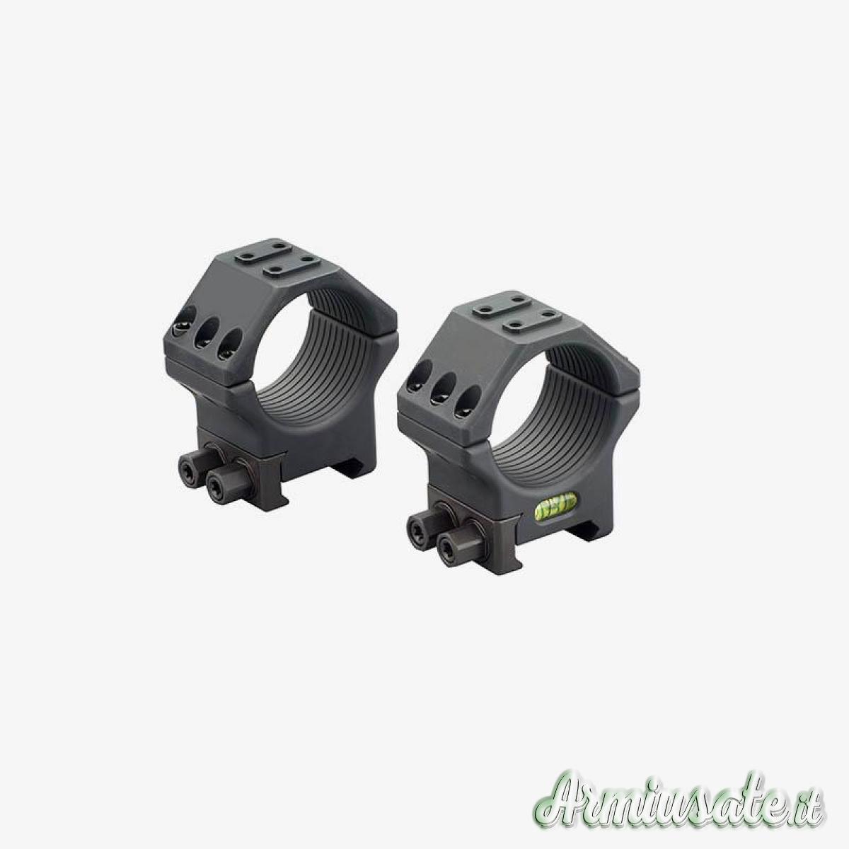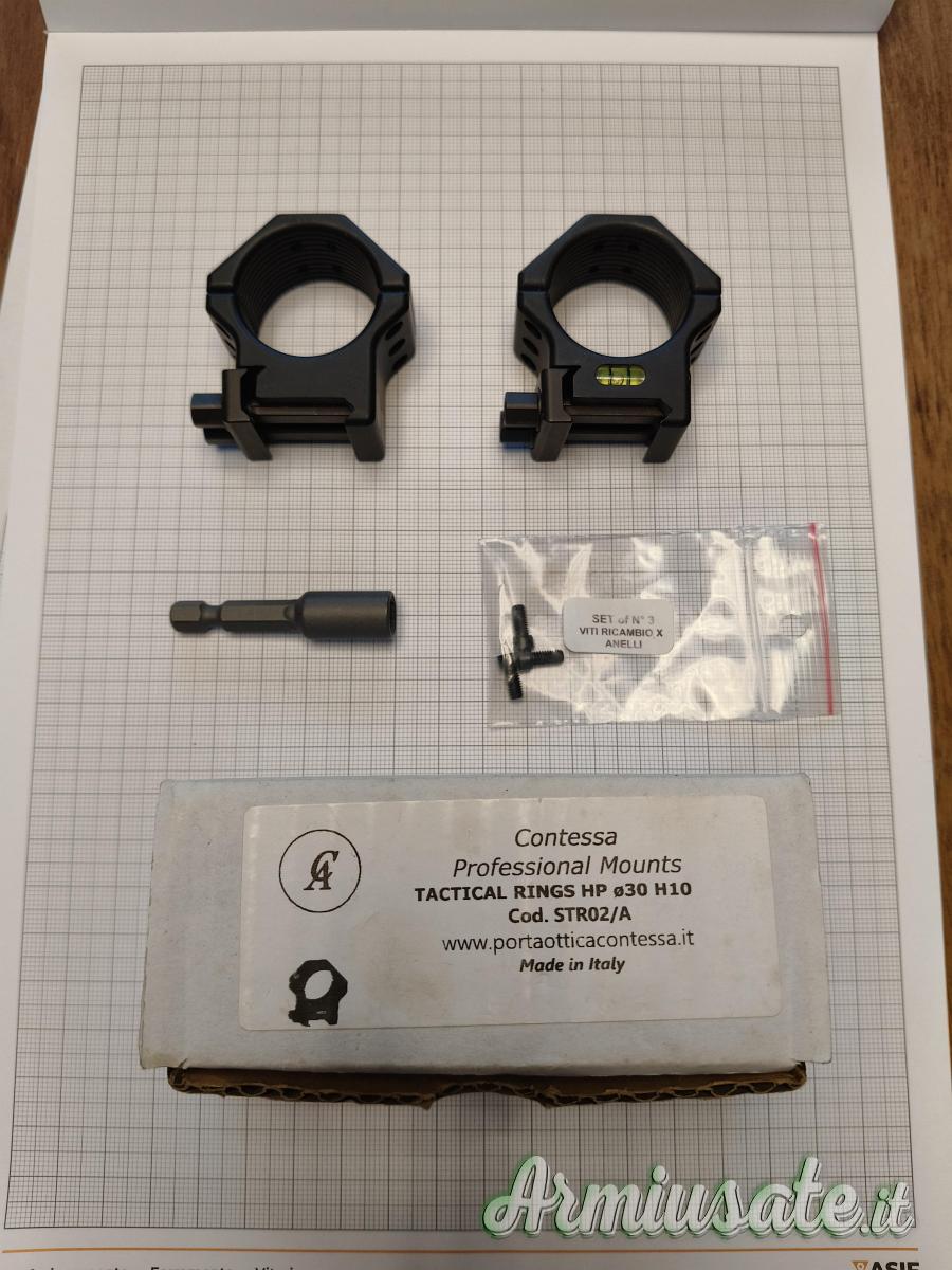 Coppia anelli in acciaio Contessa Tactical STR02/A con bolla di livello integrata, diametro 30mm H 10 mm, 6 viti di chiusura del coperchio, larghezza anello 24 mm, con doppio dado di chiusura e doppio traversino di tenuta sulla slitta. Perfetti, mai montati, in confezione originale, corredata di chiave di serraggio e viti di riserva.