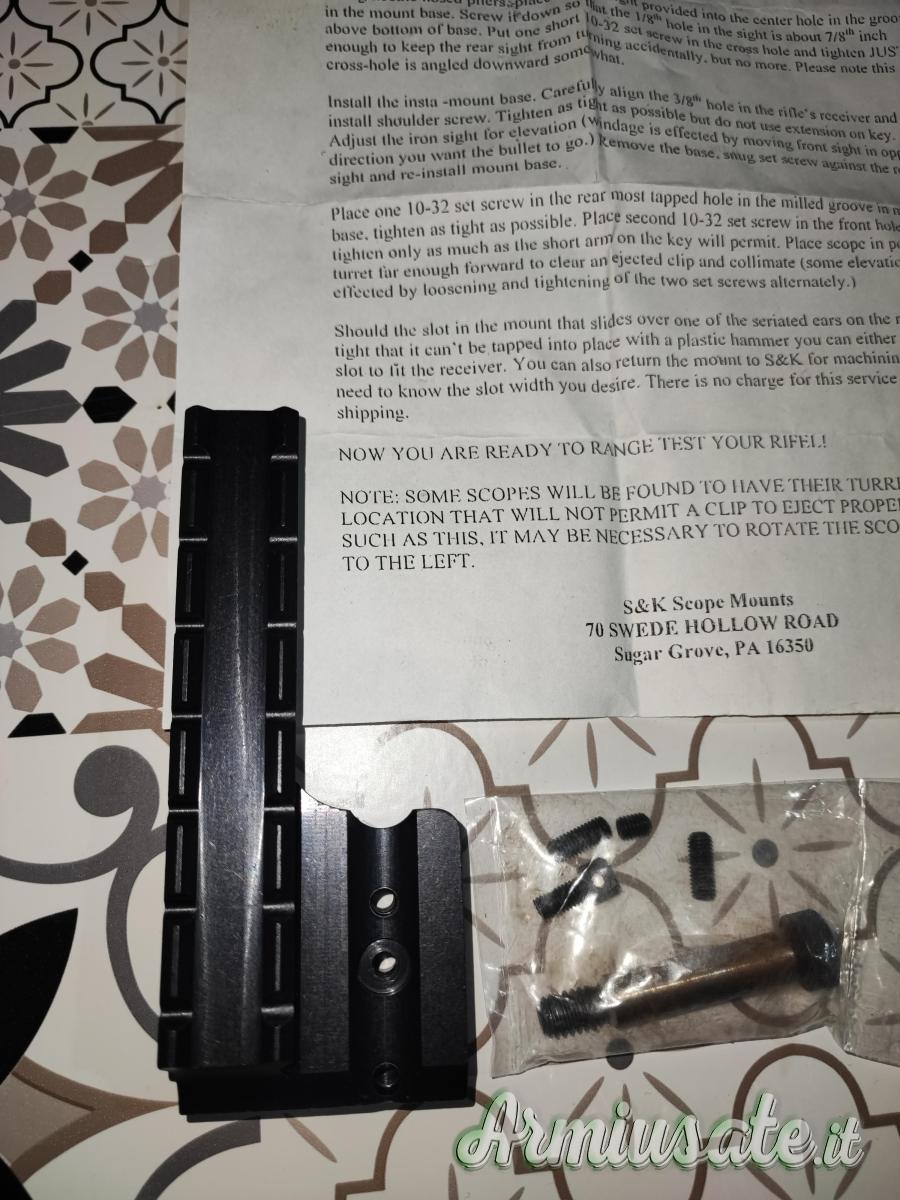 Vendo attacco ottica per Garand marca S&K USA, nuovo e mai usato. Ritiro a mano a Pomezia o spedizione tramite correire SDA a 8 euro a carico dell'acquirente.