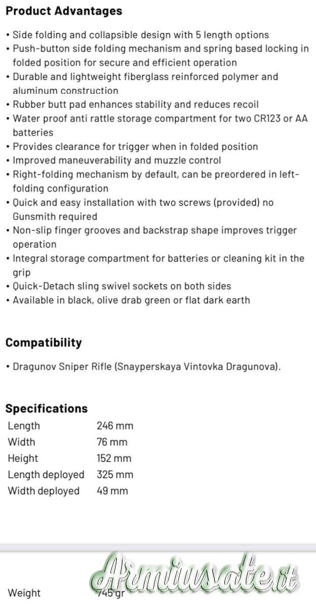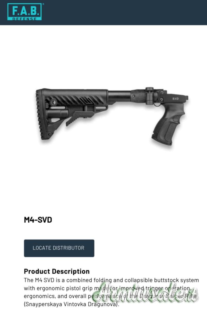 Calcio tattico pieghevole M4 SVD SB Fab Defense – in stile "M4", provvisto di sistema ammortizzato e regolazione in 5 posizioni di lunghezza.