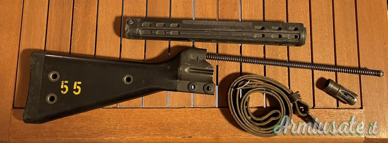 In blocco calcio, impugnatura, astina, cinghia in cuoio e spegnifiamma.