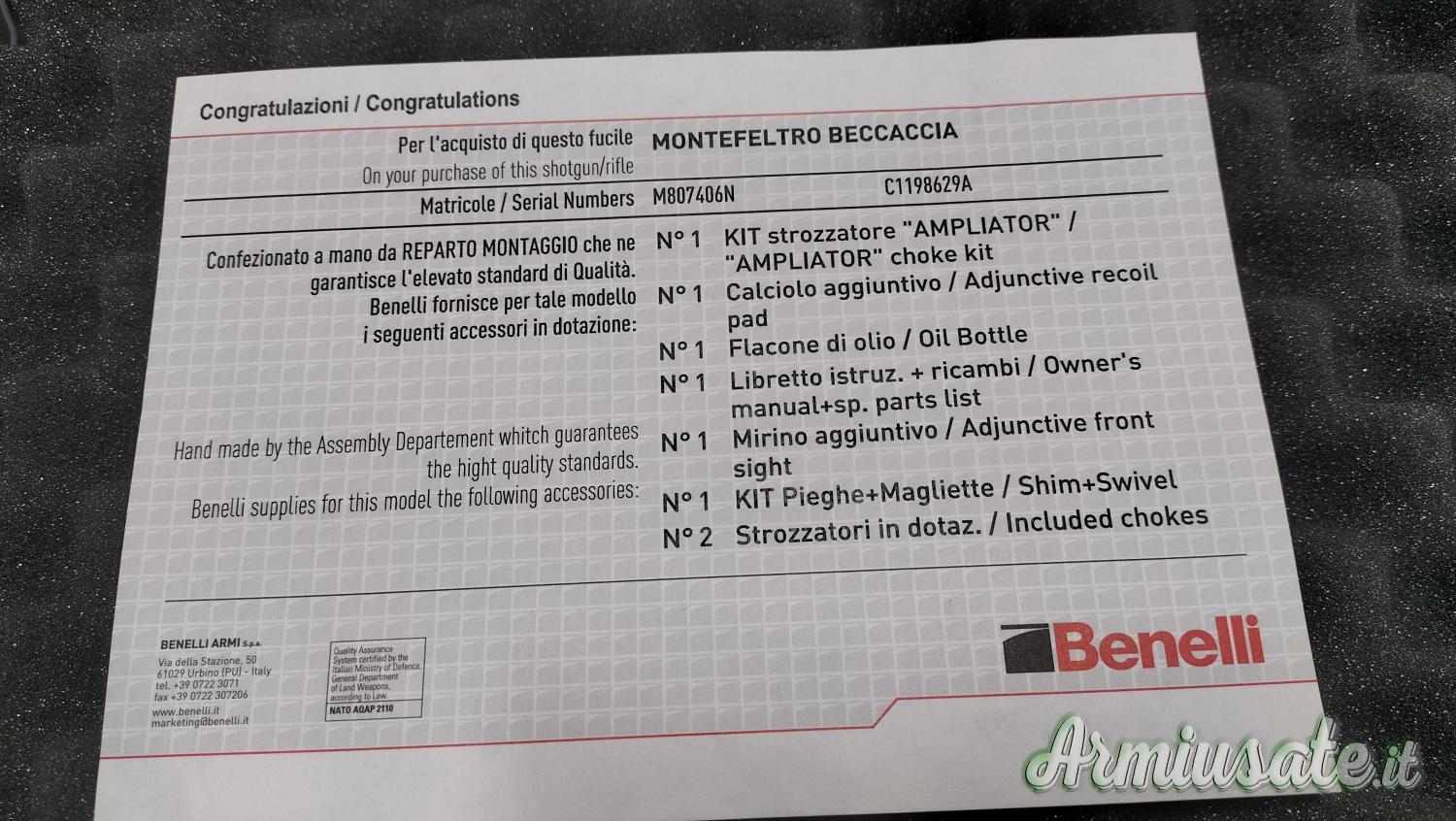 IL FUCILE AL MOMENTO DELLA REGISTRAZIONE GARANZIA USUFRUIRA' DELLA PROMO BENELLI CASHBACK