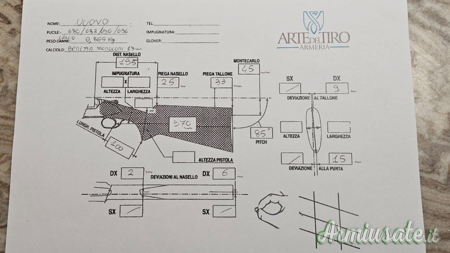 - calcio Dx grado superiore misure nasello 25-33mm, montecarlo 45mm, lunghezza calcio 370mm. (foto smontato con foglio misure).