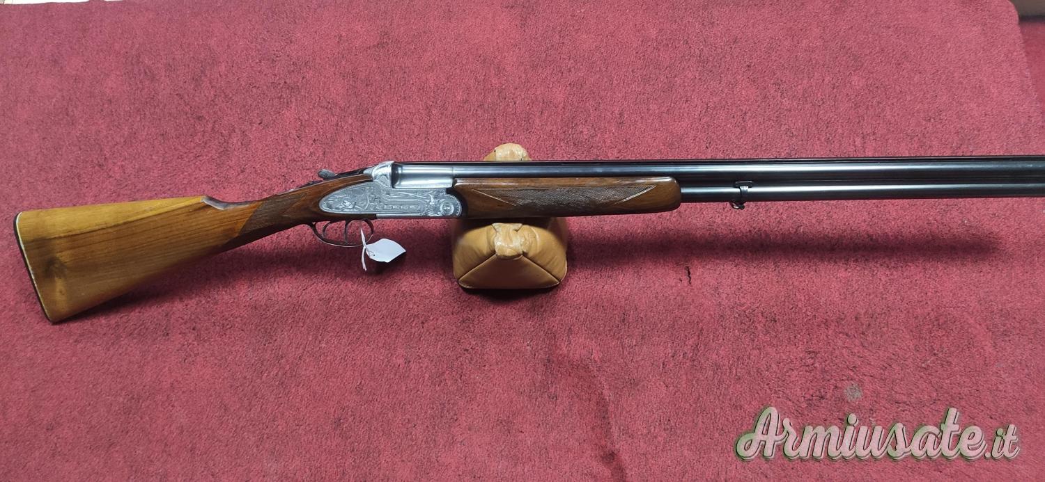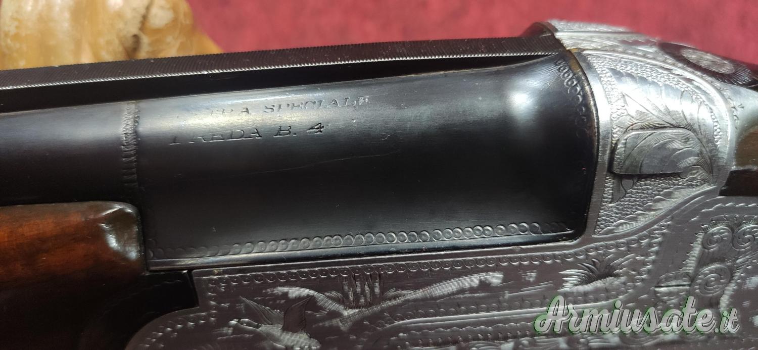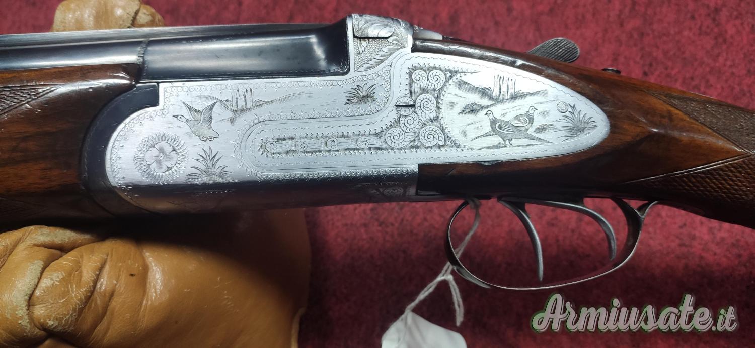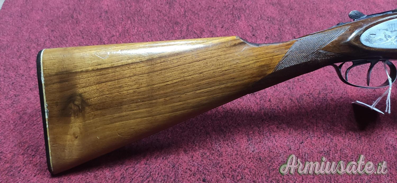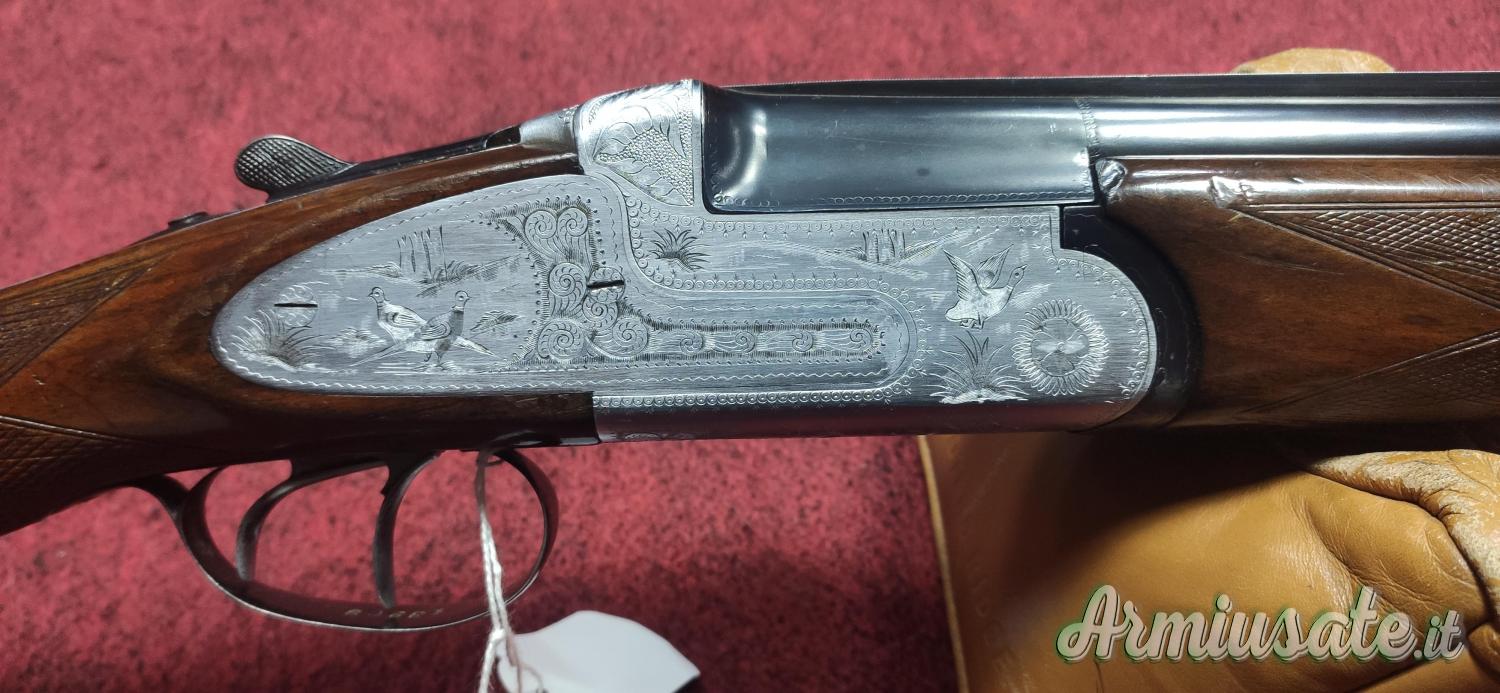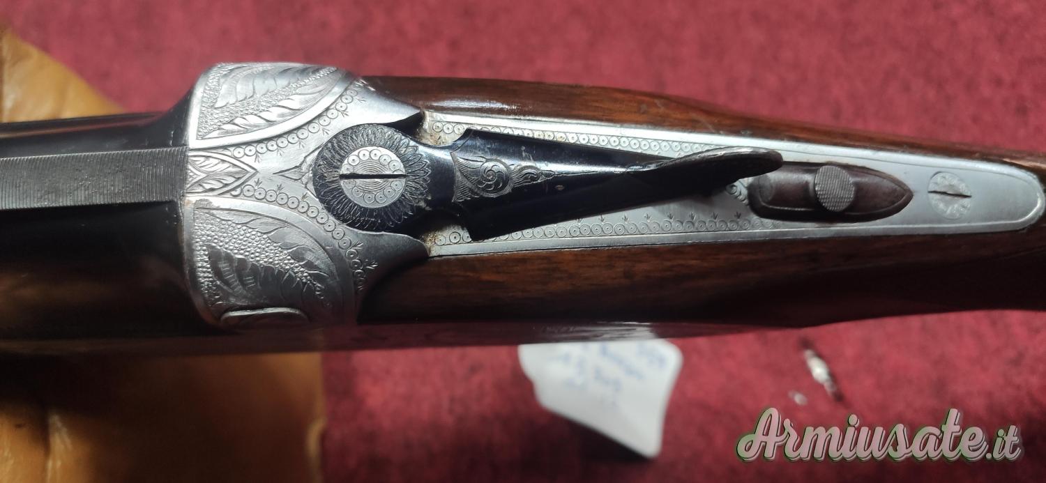 Bascula con cartelle lunghe con incisioni floreali e di scene di caccia, bigrillo con estrattori manuali, calcio all'inglese. Condizioni molto buone, arma ottima per i tiri a lunga distanza per la caccia ai Colombacci.