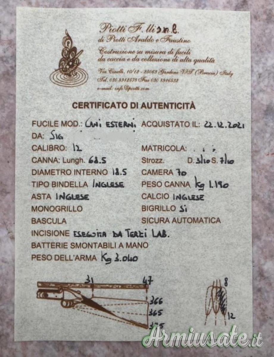 Fucili a canna liscia - Doppietta Piotti cani esterni armamento automatico cal 12 canne 68.5 incisione Terzi............