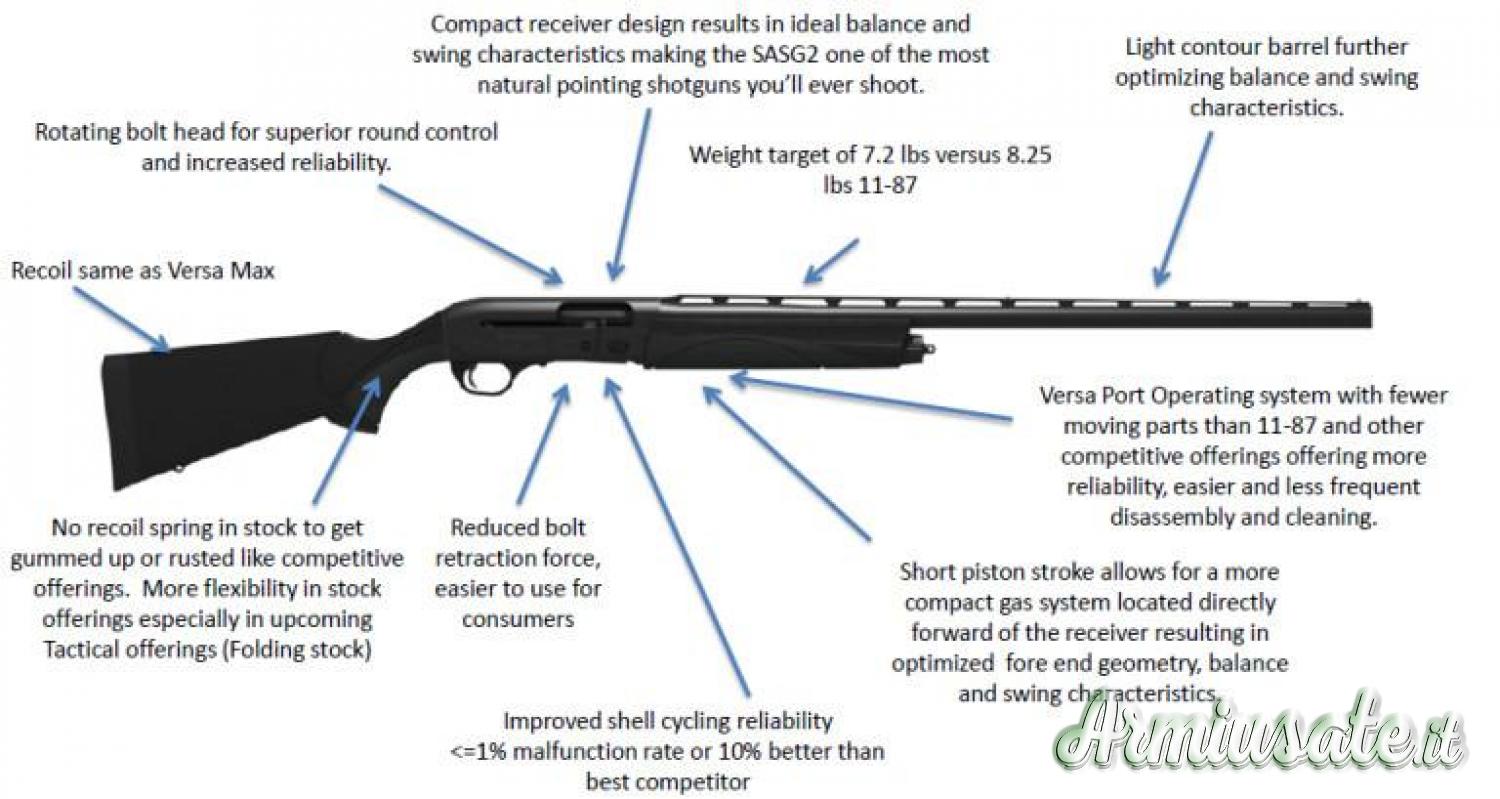 Funzionamento con sistema di recupero gas VersaPort (brevetto Remington), un sistema composto da sette porte a gas e due pistoni a gas che consentono una maggiore versatilità di carico, un'apprezzabile attenuazione del rinculo (è un calibro 12 ma sembra di sparare con un calibro 20) ed una rilevante riduzione della manutenzione ordinaria dell’arma. Il sistema a gas Versaport regola in modo completamente automatico la pressione del gas, aumentando comfort ed affidabilità. La Remington ha infatti progettato questo semiautomatico installando questo sistema autopulente che ne garantisce durata e affidabilità, comprovata dalle decine di migliaia di colpi sparati senza inceppamenti durante il “torture test”. ARMA NUOVA IN PROMOZIONE, SOLO UN PEZZO DISPONIBILE!