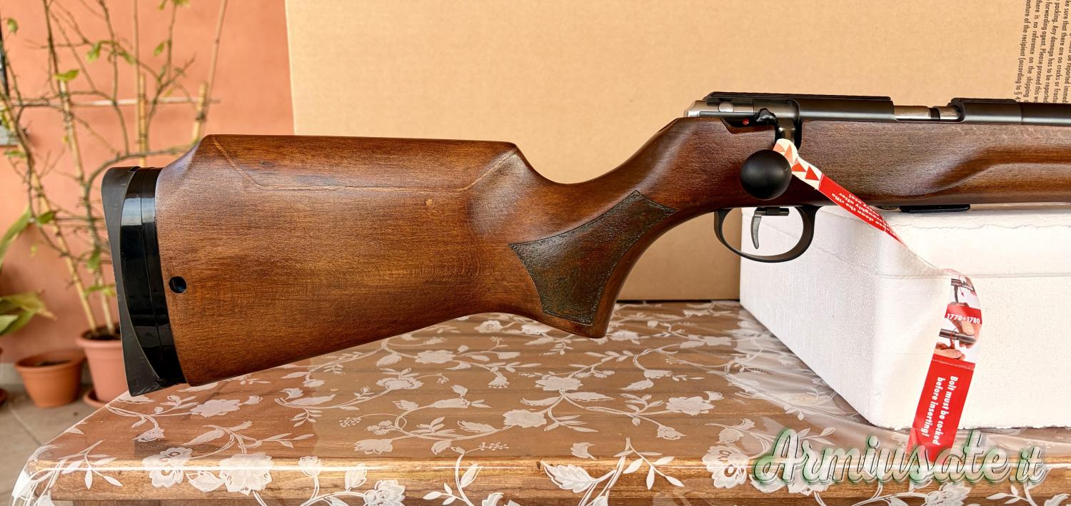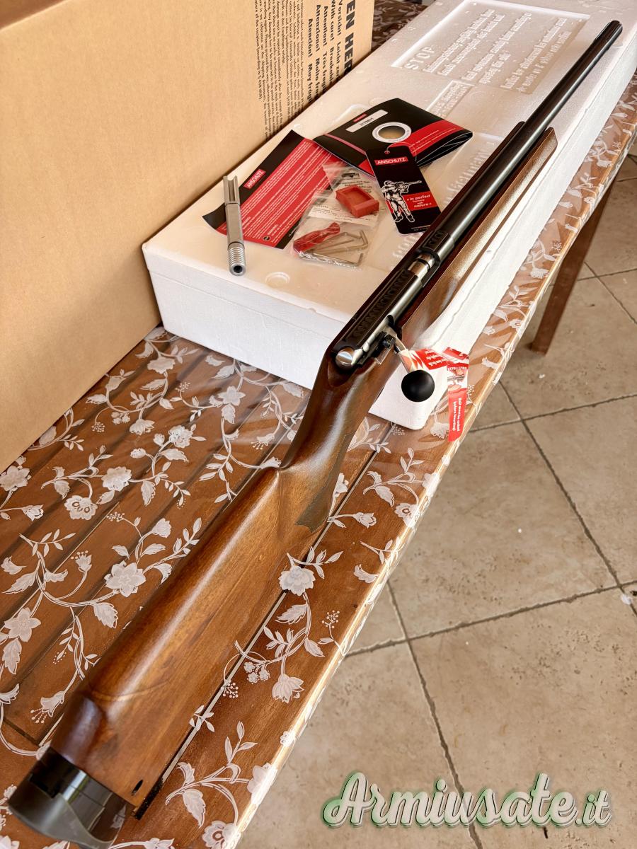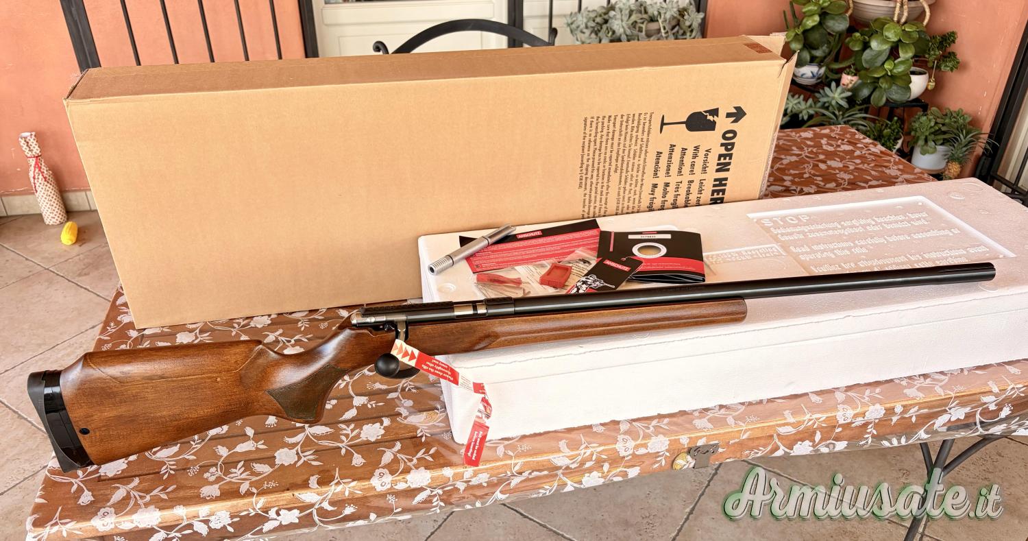 La carabina ha sparato non più di 150 colpi, soltanto provata, nuova senza alcun segno di usura, precisione altissima, completa di scatola e accessori originali, caricatore colpo singolo e guida bacchetta originale.