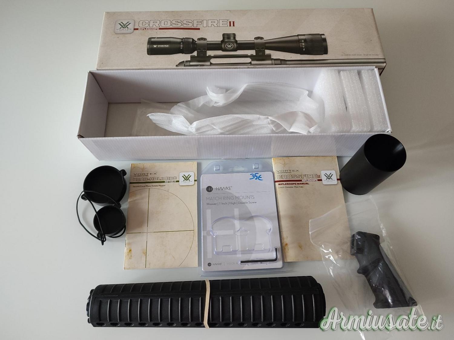 A corredo cannocchiale Vortex Crossfire II 6-18x44 con attacchi di marca, coprilenti e paraluce, scatola, istruzioni ed imballi; oltre ad astina ed impugnatura native per eventuale ripristino alla conformazione originale; tutto pari al nuovo.