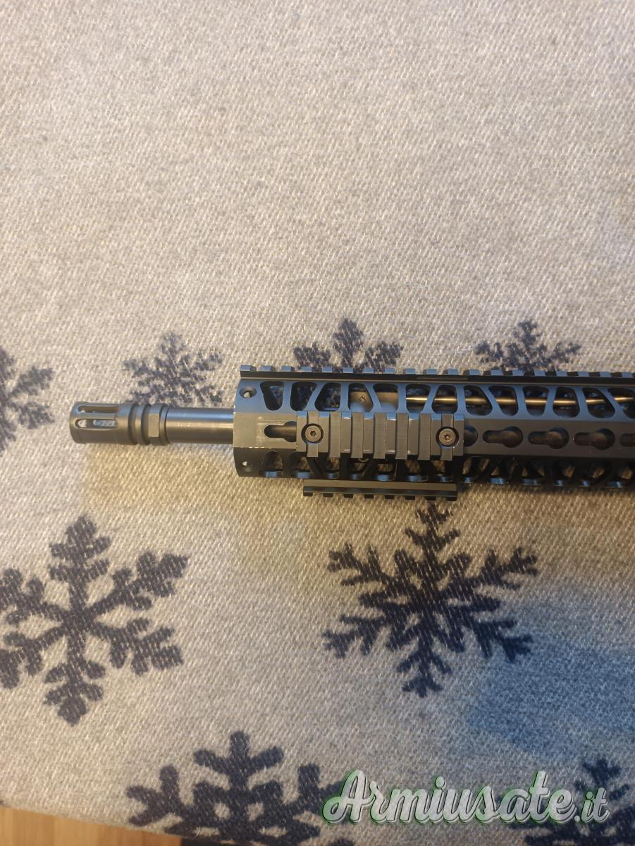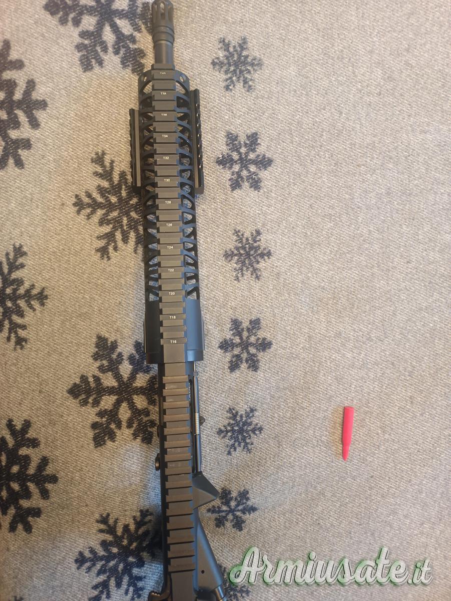 Descrizione: Carabina semiautomatica mil-spec sportiva ADC (Armi Dallera Custom) modello M5 SPECIAL FORCE con accessori della ditta israeliana Fab defense: Caricatore in polimero da 29 colpi, calcio telescopico e impugnatura anatomica. Questa carabina monta una canna pesante Lothar Walther da 12,5”, handguard in alluminio sul quale possono essere montati accessori, carabina costruita completamente in Italia, arma catalogata sportiva.
