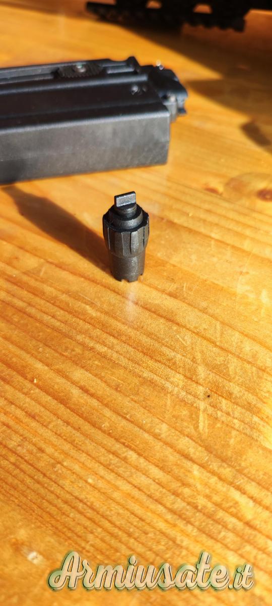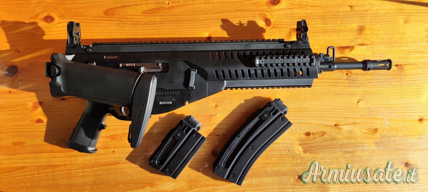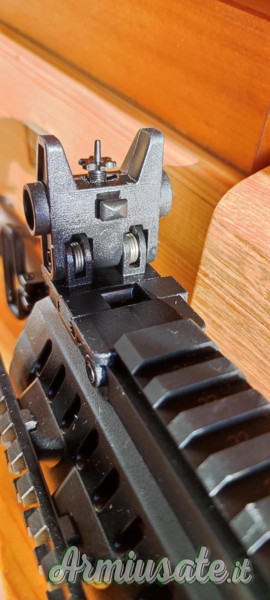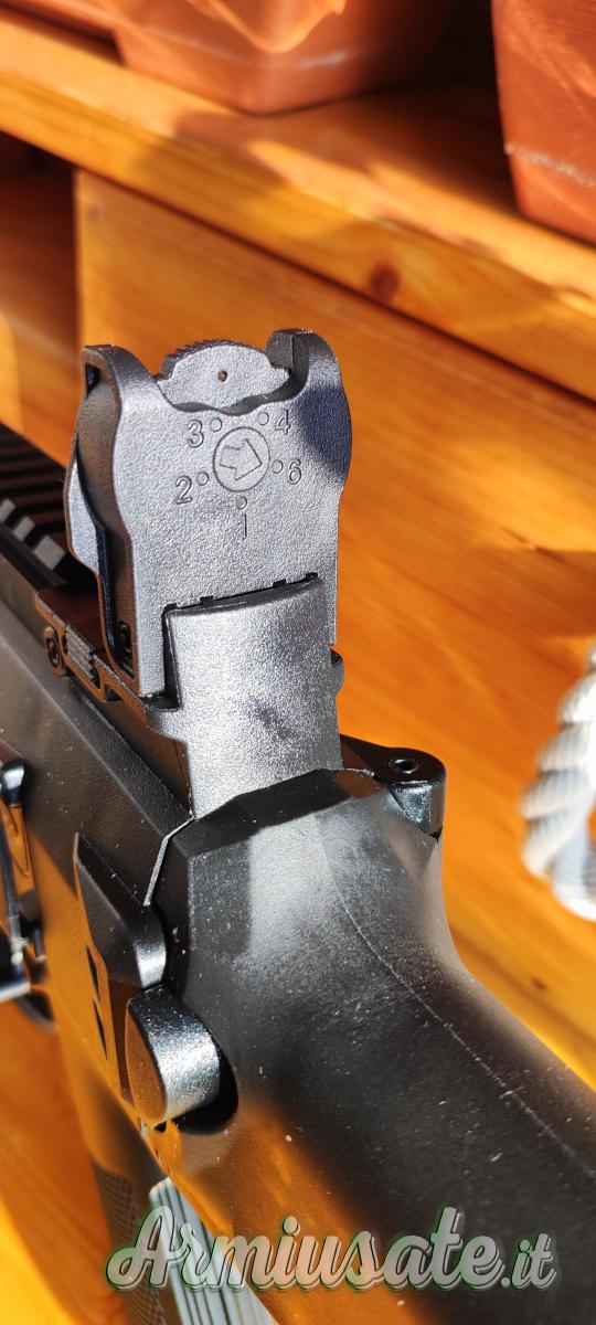 Calcio ripiegabile, estensibile, manetta armamento reversibile, mire abbattibile e attrezzi o per regolarazione.