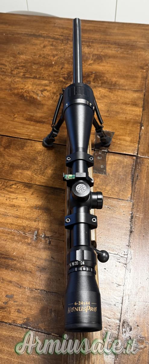 La carabina monta uno scatto alleggerito TIMNEY TRIGGER (pagato 220,00 €), bipede Champion Mobile 40855 richiudibile e basculante (pagato 70,00 €), ottica KONUS Konuspro 6-24x44 (pagata 190,00), attacchi ottica di alta qualità. In regalo copri ottica in silicone (pagato 20,00 €) e valigia Solognac (pagata circa 50,00 €). Solo di accessori superiamo i 500,00 € di valore! In dotazione anche lo scatto originale CZ ed il manuale dell’ottica Konus