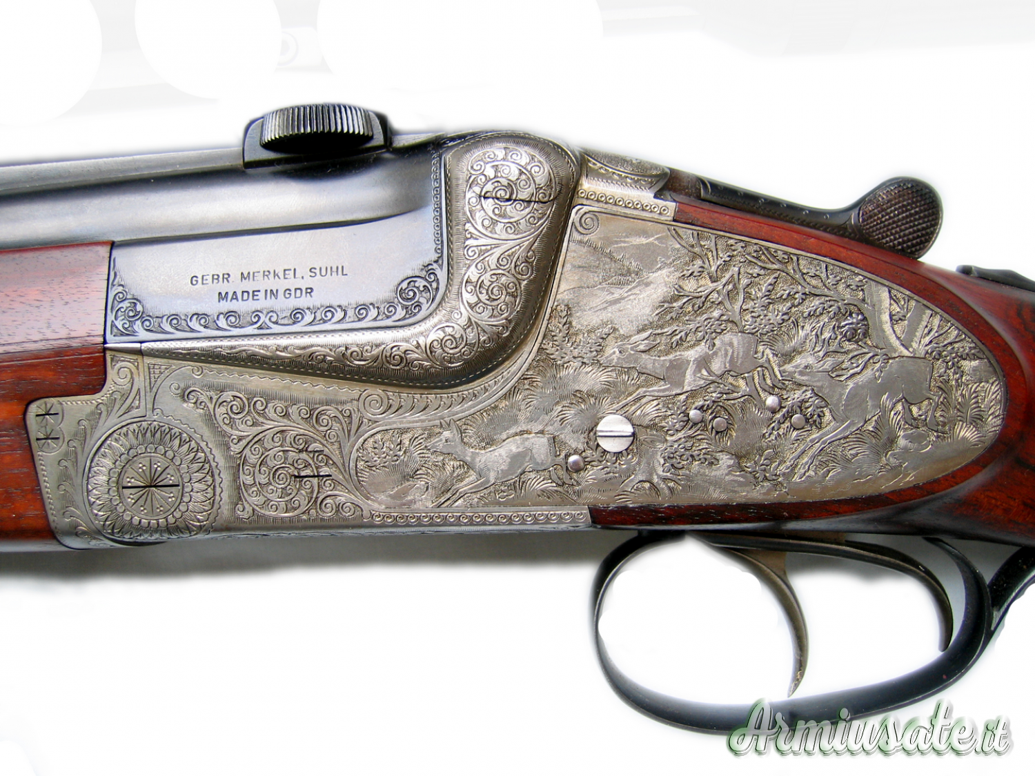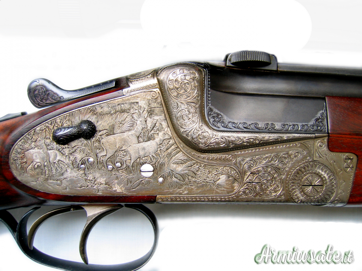 Speciale calciolino in gomma. Guanciale bavarese. Ricchissima incisione scene di caccia. Ottica swarovski 3-10×42 reticolo 4. attacchi piede di porco. arma nuova al 99%. certificati dell’arma ed ottica. AFFARE !!!