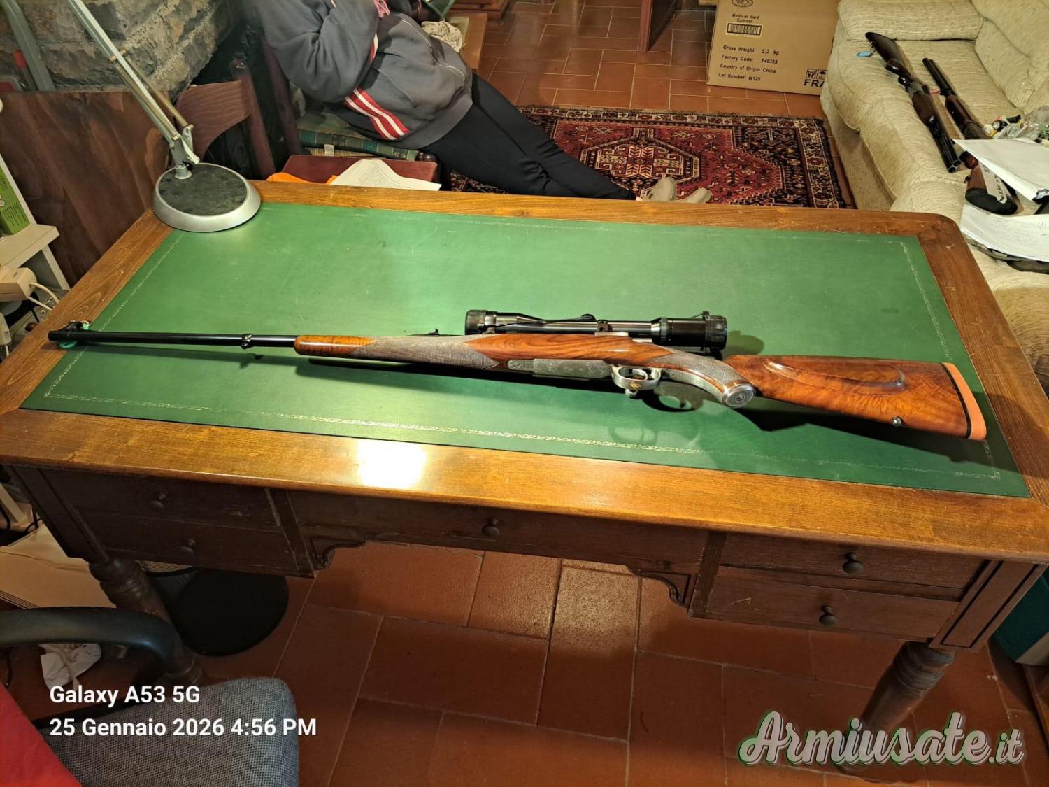 Ottica: Monta un cannocchiale di alta gamma (Swarovski) con attacchi a piede di porco (Suhl Mount) realizzati artigianalmente, che garantiscono il mantenimento perfetto della taratura.