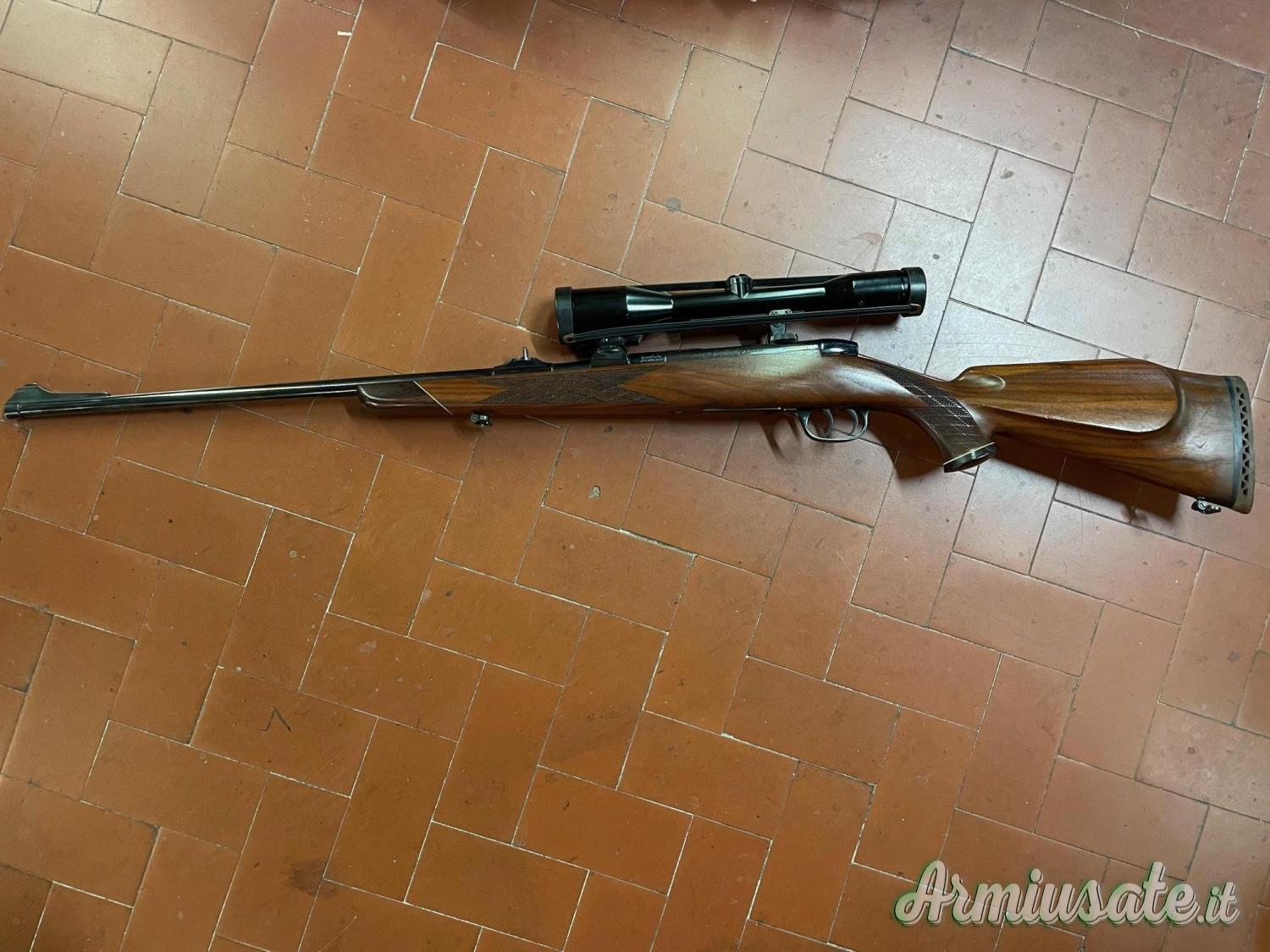 Questo che vi presentiamo e chiamato dai collezionisti Junior in quanto il piu piccolo della serie, carabina dotata di ottica Zeiss Diatal.-D 6x42 con attacco a piede di porco , bellissimi legni in stile Weatherby ,arma dotata di stecker.