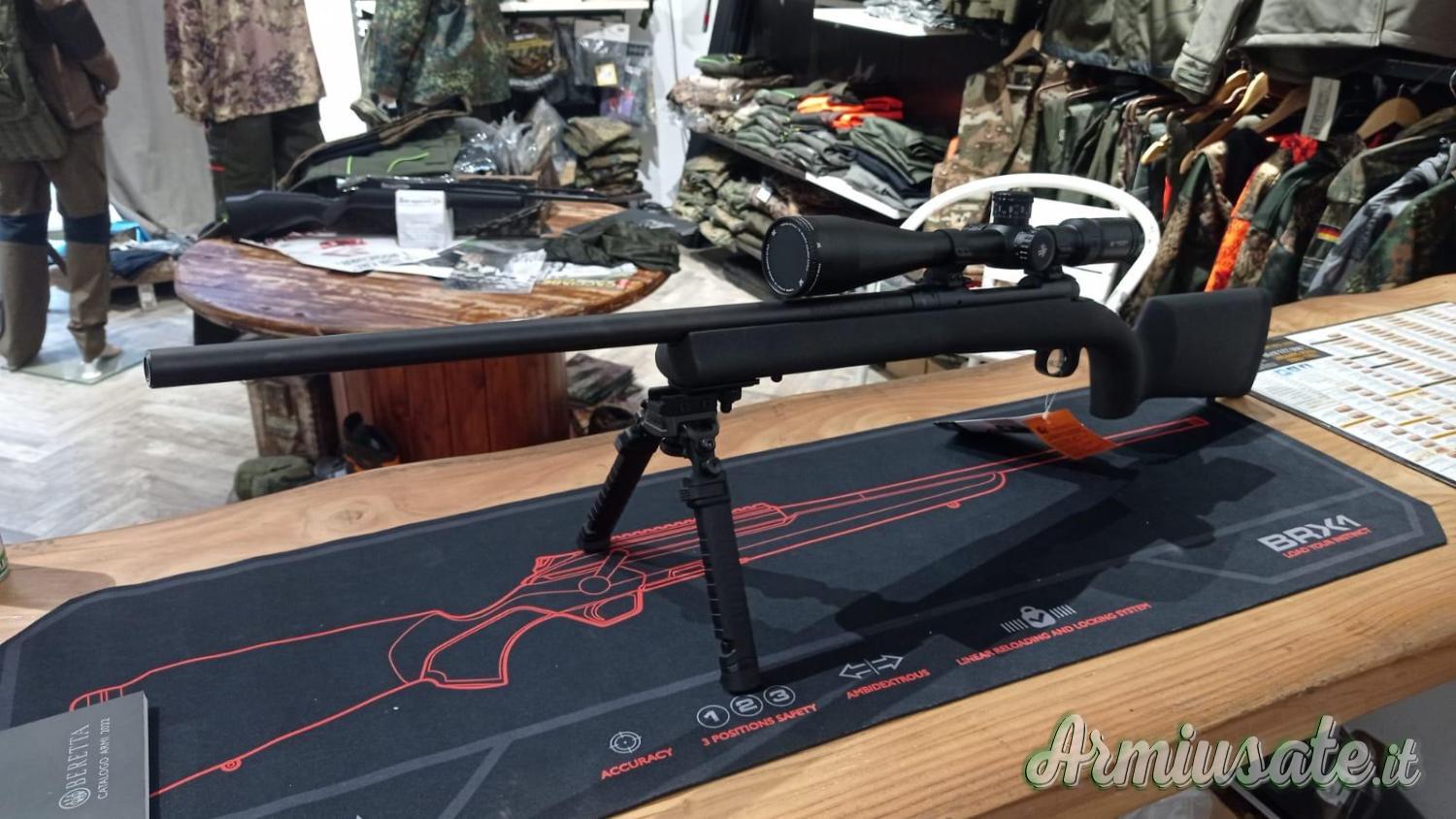 Sparati 75 colpi per taratura ottica 100-200-300 metri, carabina molto precisa in calibro 300 Winchester Magnum, calciatura in lana di vetro, lunghezza canna 24” (608 cm).
