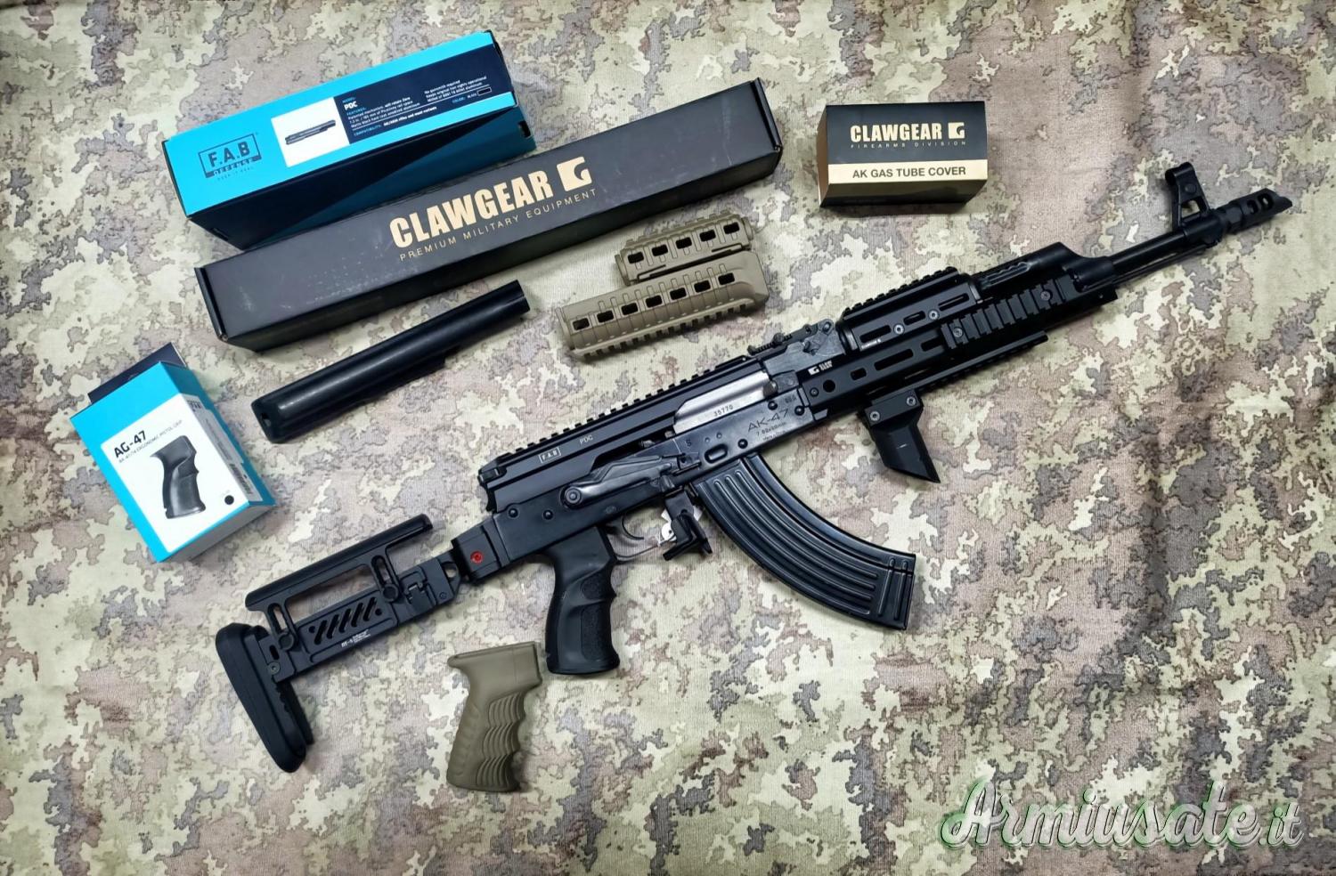 Arma completamente custom con handguard CLAWGEAR, calcio richiudibile con calciolo e poggia guancia regolabili ZENITCO replica; impugnatura anteriore, freno di bocca AUDERE; dust cover FAB DEFENSE non compreso, sarà consegnato con dust cover originale.