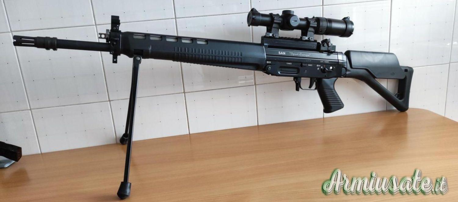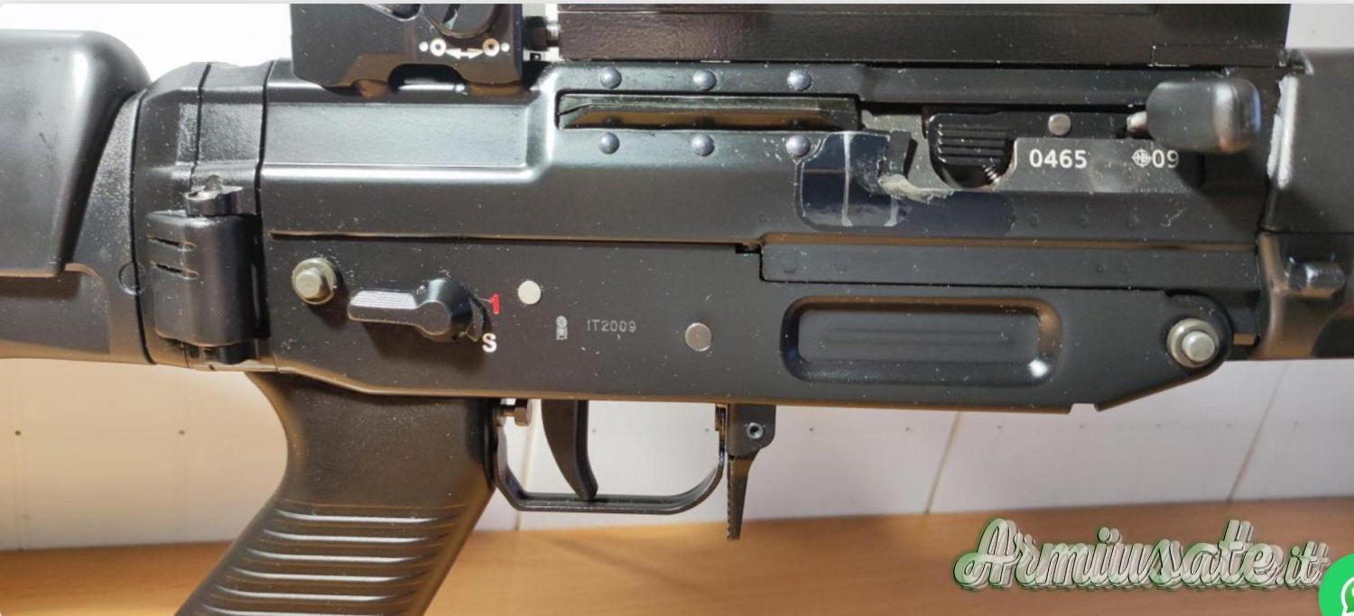 Spegni fiamma, doppio caricatore, poggia guancia, calcio ripiegabile, guardia grilletto basculante e bipiede integrato nel guardamano.