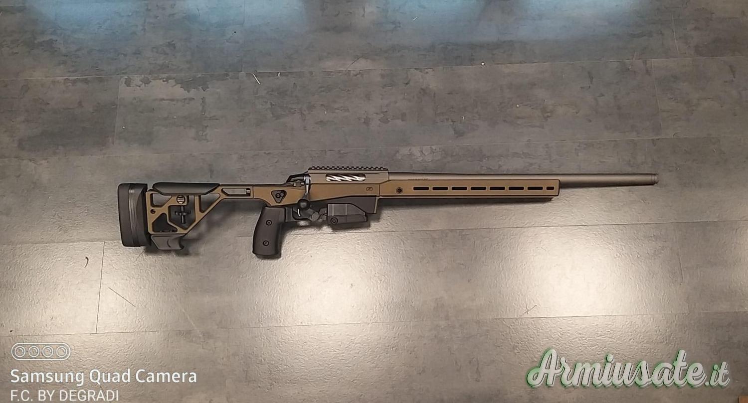 TIKKA T3X ACE TARGET CERAKOTE CAL. 308 W. CANNA 60 CM. FILETTO MT5/8X24 Precisione ed affidabilità impareggiabili con la T3x Ace Target Design ed ergonomia perfetti per il tiro sportivo, materiali di altissima qualità garantiscono durata nel tempo. È dotata di canna pesante con profilo da 22mm che assicura la massima riduzione delle vibrazioni per una precisone assoluta e rosate compatte anche a lunghissima distanza. In volata è presente una filettatura con passo 5/8×24 per apporre, opzionalmente, un freno di bocca. La lunghezza totale è regolabile grazie a spaziatori da interporre tra stock e calciolo, anche il nasello è regolabile per assicurare un allineamento sempre perfetto con l’ottica da puntamento. Il pistol grip è totalmente regolabile, anche in angolazione, per garantire così la giusta distanza tra dito e grilletto. In questo modo si garantisce massima ergonomia a tutti gli utilizzatori, anche i più esigenti. Stock e forend sono predisposti per accettare pesi aggiuntivi, sullo chassis è presente anche un thumb rest e barricade stop integrato, accessori perfetti per i tiratori di PRS più esigenti. Completano la dotazione dell’arma una picatinny rail inclinata di 20MOA, un forehand con MLOK su tre lati, interfaccia Arca Swiss RRS che consentono l’aggancio degli accessori. Il gruppo scatto è un double stage con peso di sgancio regolabile, il caricatore in dotazione è da 10 colpi. È disponibile in versione nera anodizzata o Cerakote con colorazione Midnight Bronze. CARATTERISTICHE: