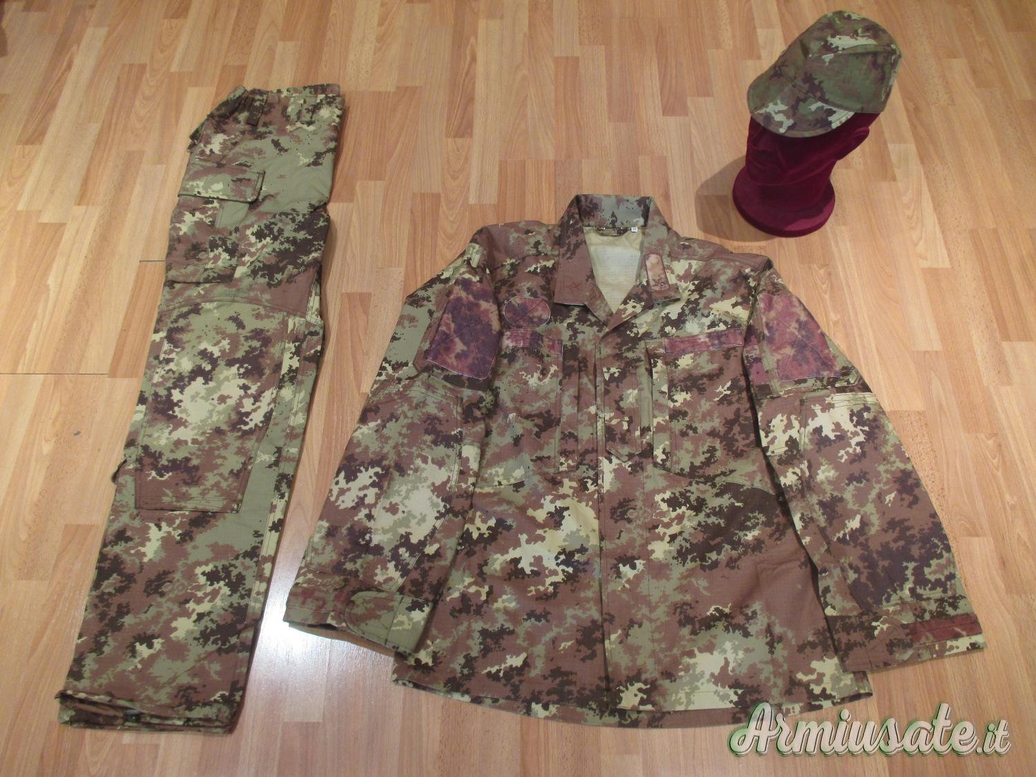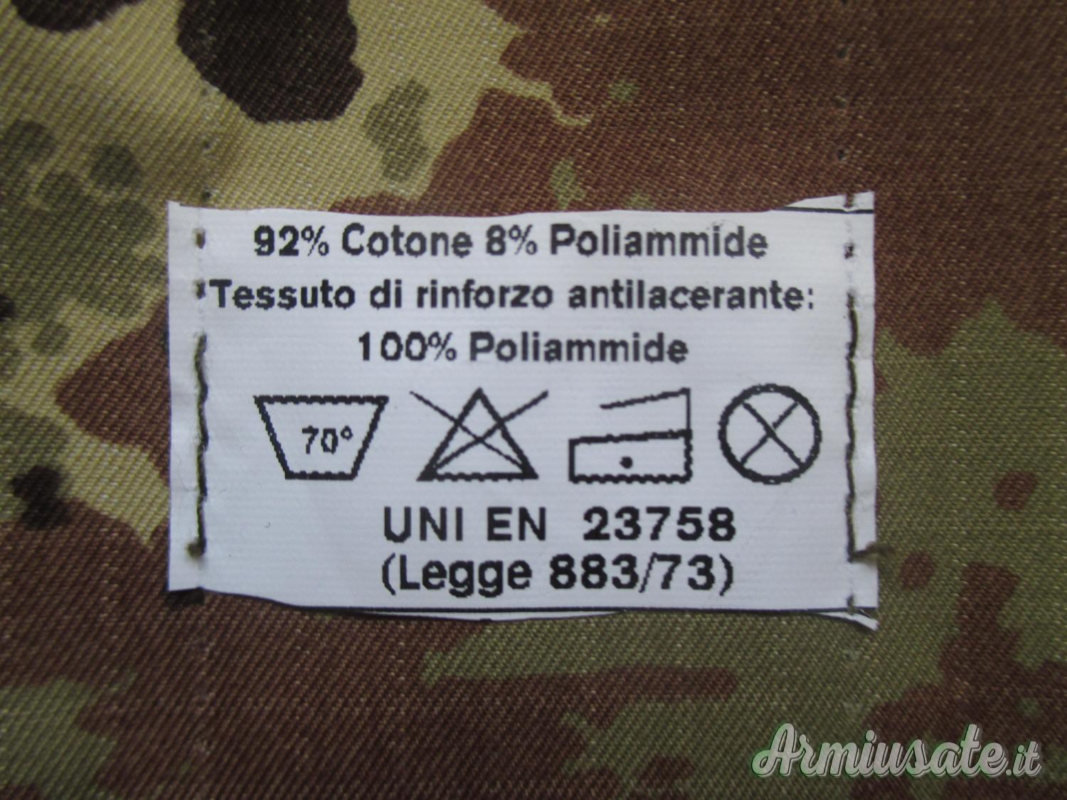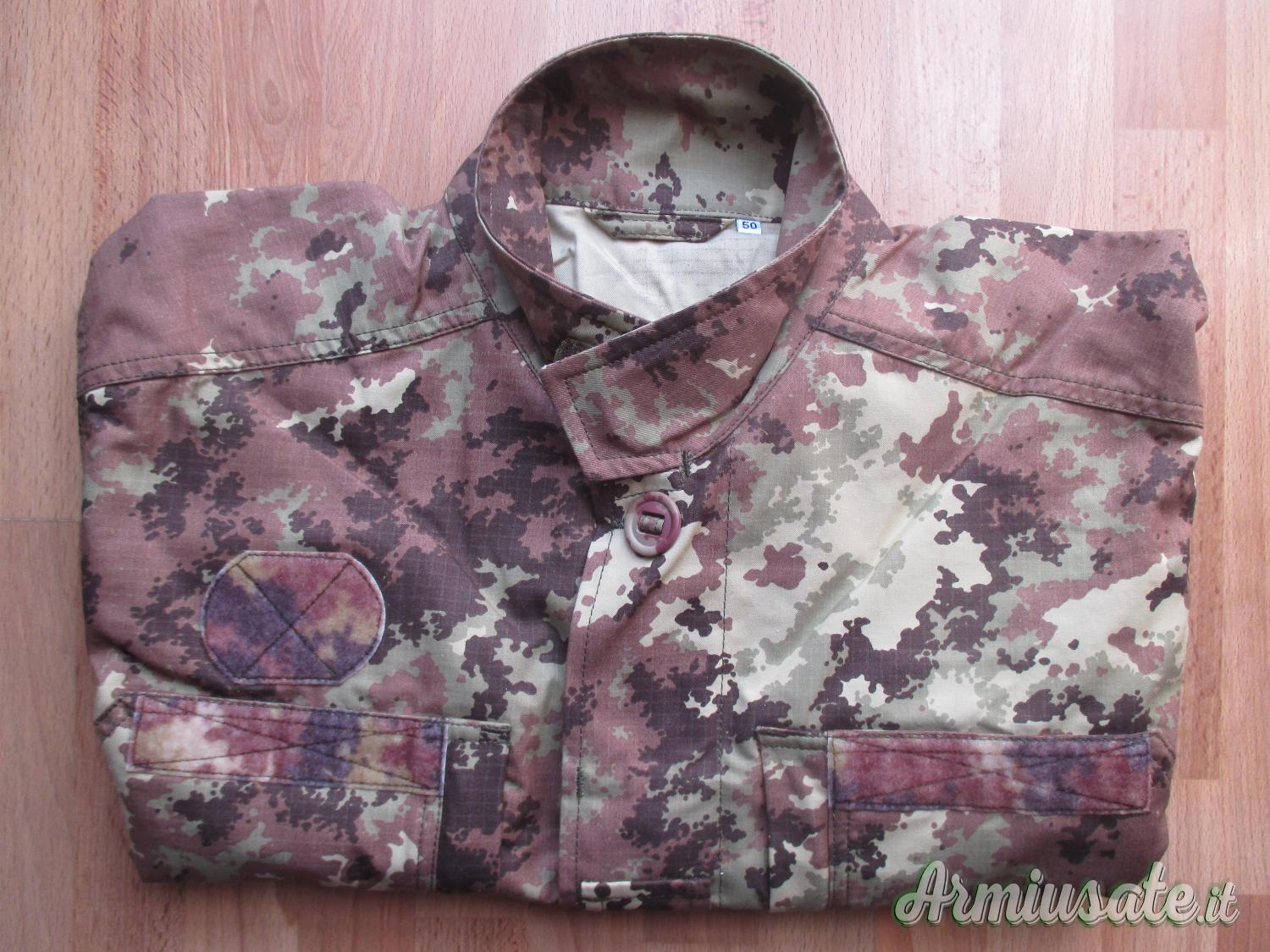 - Giubba mimetica fornita di 2 tasche pettorali esterne, 1 tasca pettorale interna sinistra, 2 tasche medie sulle manica sinistra e destra; toppe di rinforzo su spalle, rinforzi in poliestere antiabrasivo con velcri per l’introduzione di neoprene sui gomiti; velcri mimetici vegetati per scritta “Esercito” e brevetto di specializzazione (sul lato destro) per il nome (sul lato sinistro) per scudetto omerale (su manica sinistra), per lo scudetto di corpo (su manica destra); spallina porta grado centrale; chiusure a bottoni sul petto, a cerniera sulle tasche, a velcro sui polsini; sistema di regolazione interno a bottoni sui fianchi; rete di areazione sotto le ascelle. Presenta stellette sul collo, scudetto omerale “Italia”, scritta “Esercito”, velcro maschio porta nome. Le misure sono: circonferenza toracica cm 120, spalle cm 52, maniche cm 62, lunghezza 77 cm.