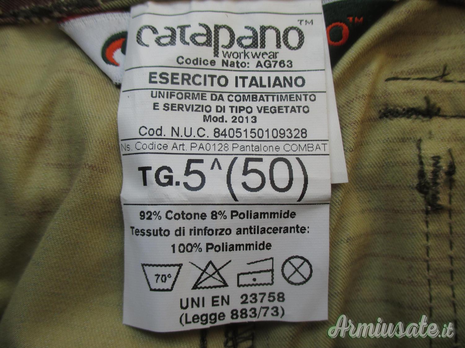 - Pantaloni mimetici forniti di 2 tasche anteriori, 2 tasche posteriori, 2 tasconi laterali, 2 tasche ai polpacci; ampie toppe di rinforzo posteriori nella zona del cavallo e delle ginocchia; rinforzi in poliestere antiabrasivo con velcri per l’introduzione di neoprene sulle ginochia; chiusure a bottoni sui tasconi laterali, a velcro sulle tasche posteriori ed ai polpacci; sistema di regolazione ad elastico sulle caviglie. Le misure sono: vita cm 90, cavallo cm 80, lunghezza cm 107.