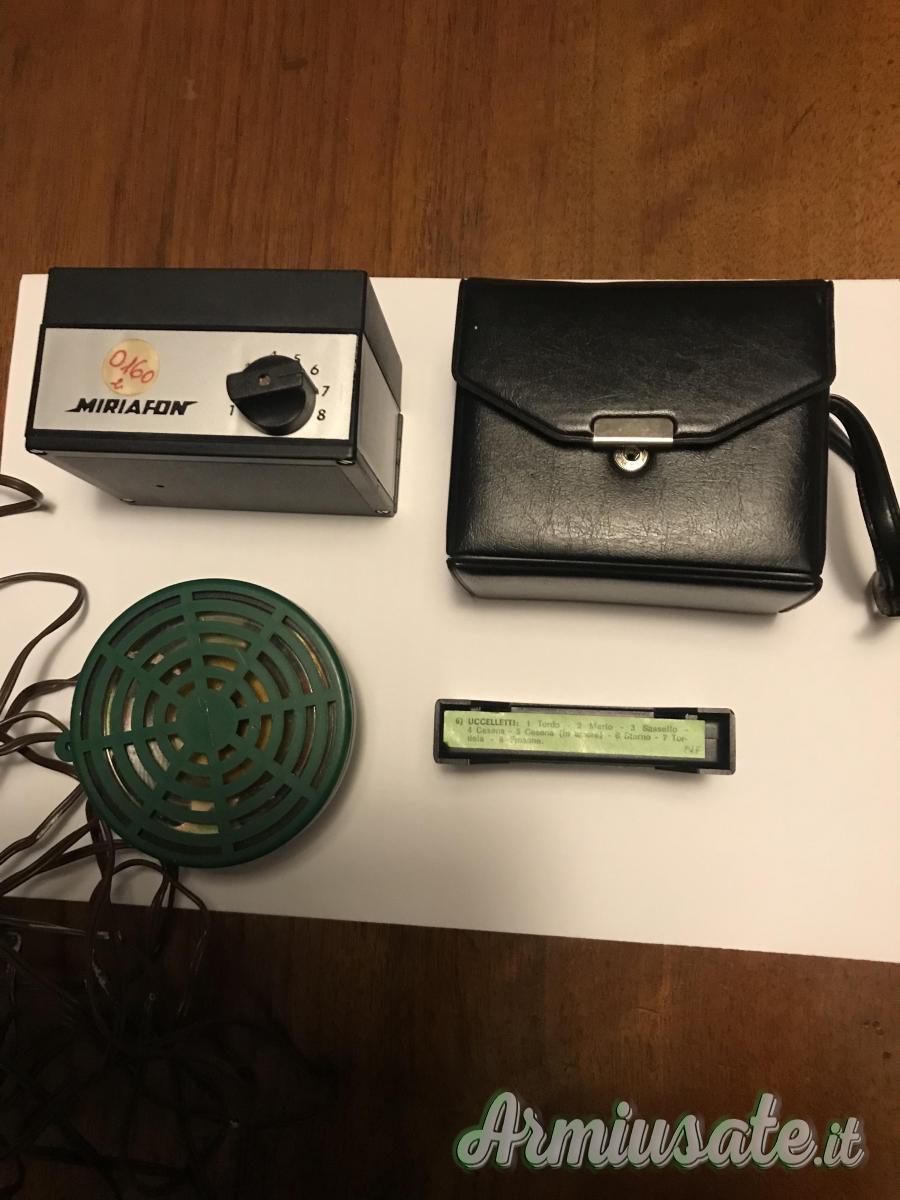Cedo richiamo MIRIAFON: funziona con cassetta e 6 pile (incluse nuove). Microfono con 6 metri di filo. Riproduce 7 canti selezionabili (merlo, storno, Cesena ecc.). Con custodia. Cedo altresì 7 richiami manuali. Il tutto in blocco. Spedizione possibile.