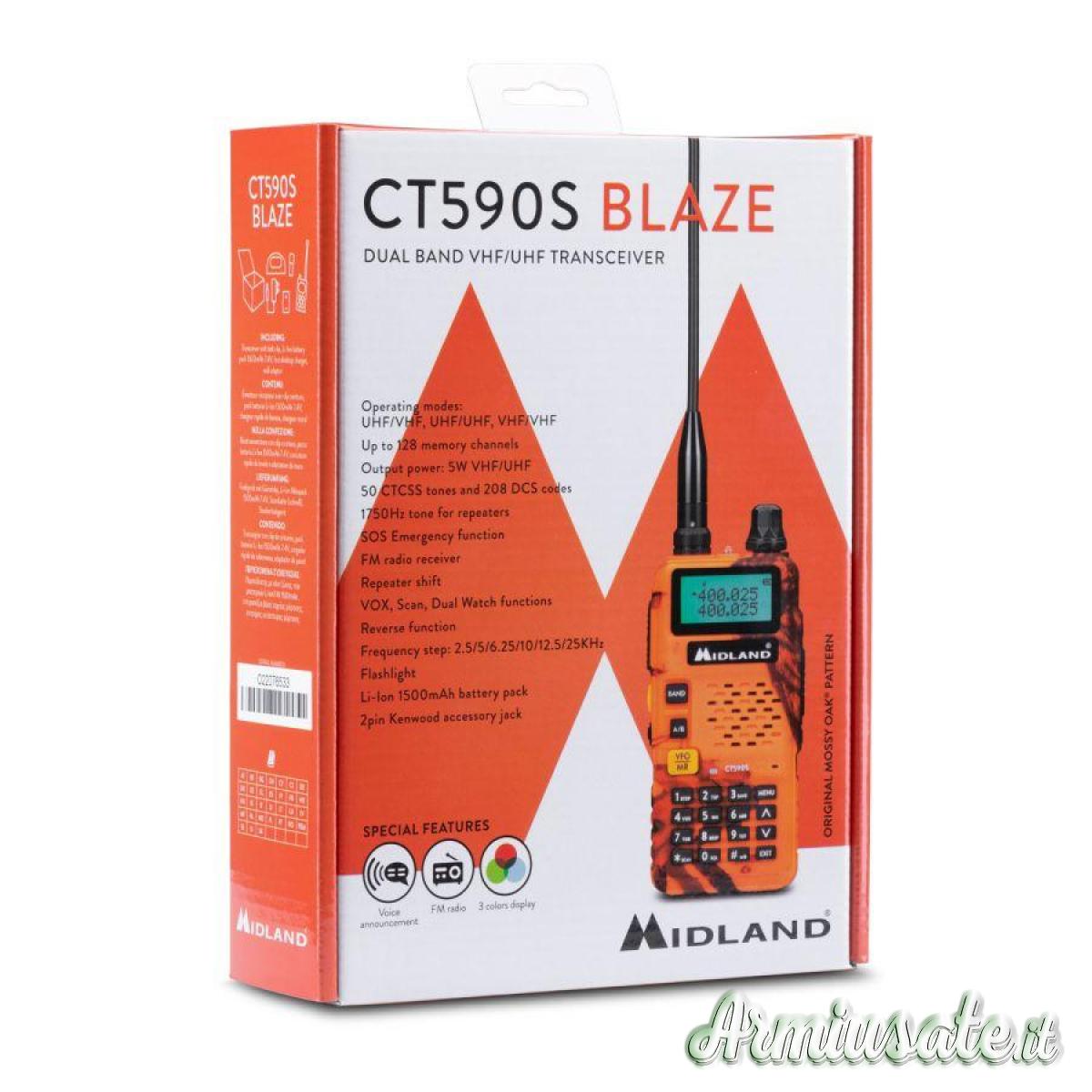 CT590 S, dual band di ultima generazione, è il nuovo modello che va ad ampliare la famiglia delle radio amatoriali MIDLAND. CT590 S è semplice da utilizzare, ideale per chi necessita di un apparato “basic” ma allo stesso tempo dotato di numerose funzioni e caratteristiche che lo rendono completa. La robustezza e l’affidabilità sono garantite dallo chassis in alluminio. CT590 S opera sulle bande di frequenza VHF 144-146MHz e UHF 430-440MHz ed è dotata di 128 canali memorizzabili. Le elevate prestazioni garantiscono ottime comunicazioni a grandi distanze, grazie anche al tono 1750Hz che permette l’accesso ai ponti ripetitori. Dispone di torcia per illuminazione notturna, di ricevitore radio FM 87.5-108MHz e di 50 toni CTCSS e 208 codici DCS che permettono di creare “sub-canali” per poter comunicare in un gruppo ristretto di persone. CT590 S permette inoltre di poter personalizzare il proprio identificativo (ANI-ID) e di poterlo inviare durante la trasmissione (PTT-ID). Il display LCD dispone di retroilluminazione regolabile in 3 colori diversi, associabili ai vari tipi di utilizzo (ricezione, trasmissione, ecc.). L’apparato è programmabile grazie al software di programmazione opzionale PRG-10, con il quale è possibile impostare e personalizzare varie funzioni, come numero canali, frequenza, ecc.
