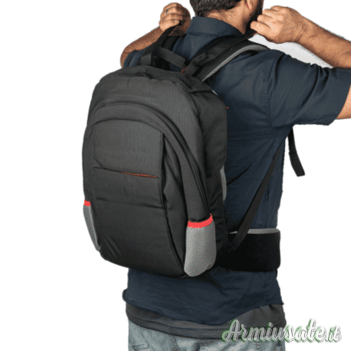 Lo zaino è progettato per l’uso regolare da parte degli studenti per trasportare libri, laptop e altri oggetti. La parte del gilet è chiusa in una sezione separata dello zaino e non è visibile durante l’uso quotidiano dello zaino.