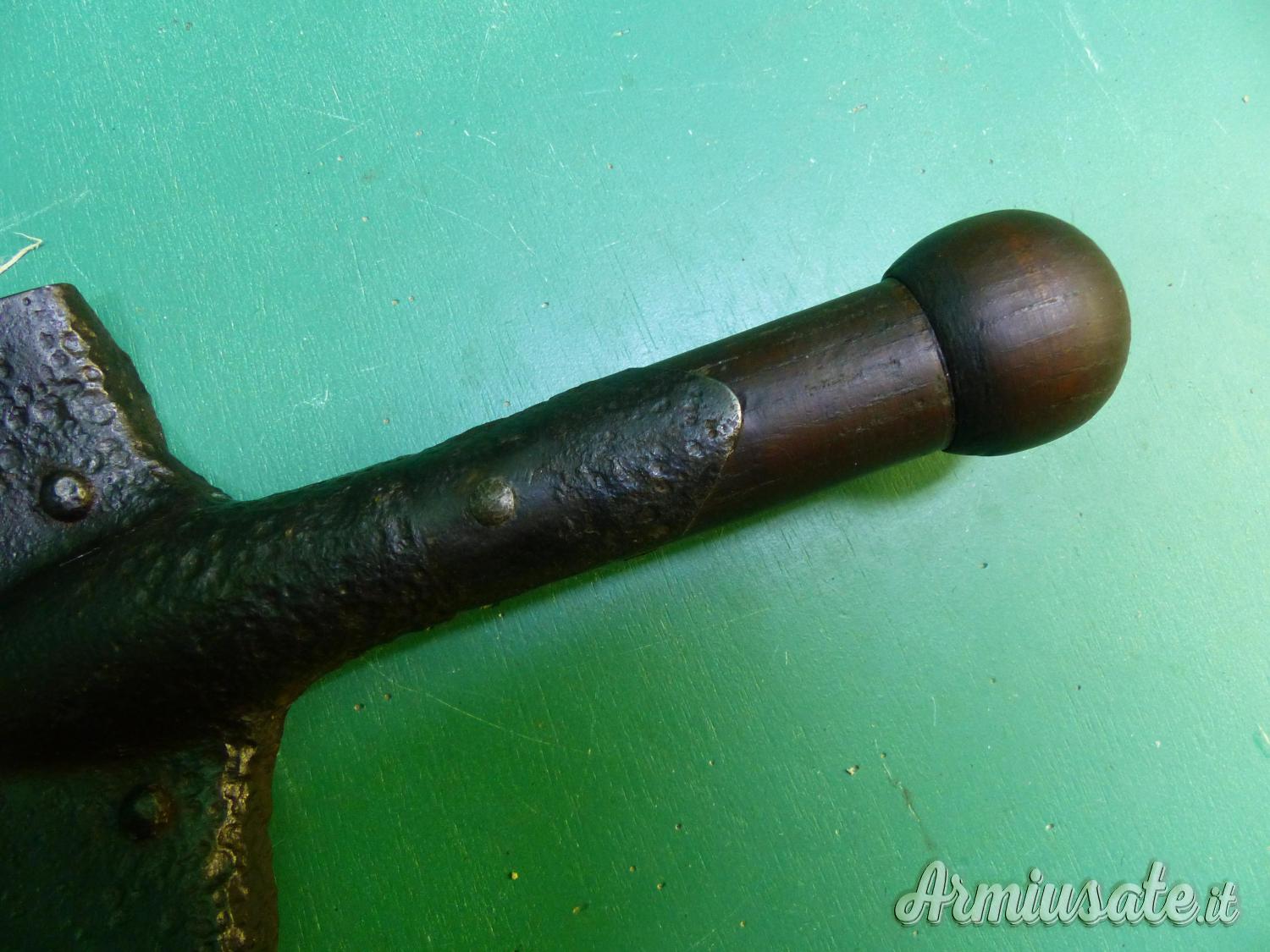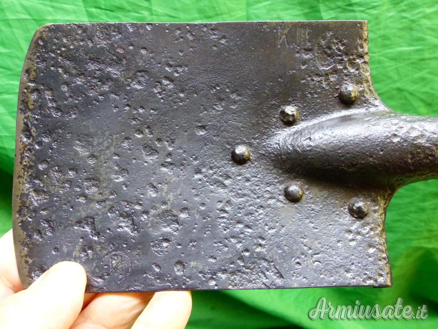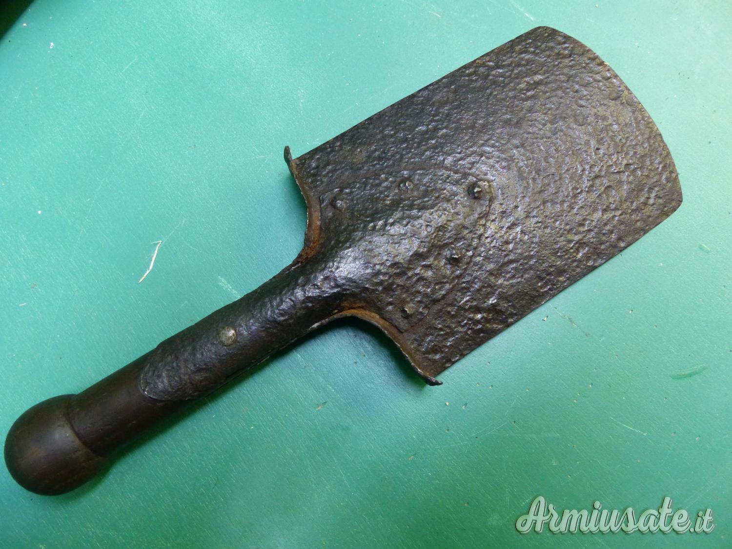 Attrezzo / Paletta russa, con 2 marci e la data 1915. La impugnatura di legno non è coeva ma rifatta ad imitazione della paletta tedesca per mitragliere .vds il confronto nella ultima foto. Rara.